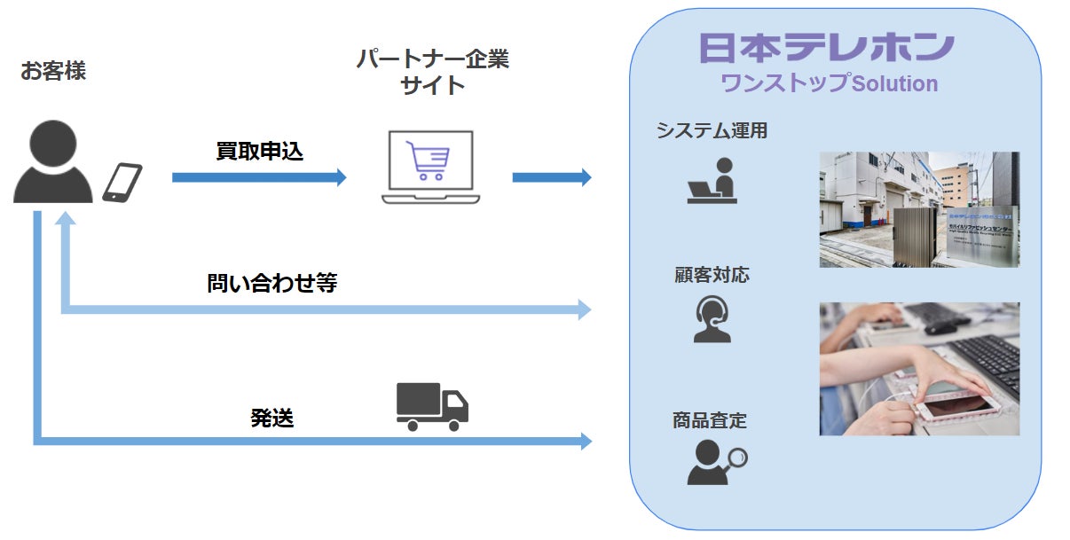本プログラムの特徴といたしまして、システム運用から申し込み後の顧客対応、商品査定まで当社にてワンストップでお任せいただけます。パートナー企業様がお持ちのオンラインショップや実店舗を活用し、下取サービス実施による販売促進効果を創出いたします。