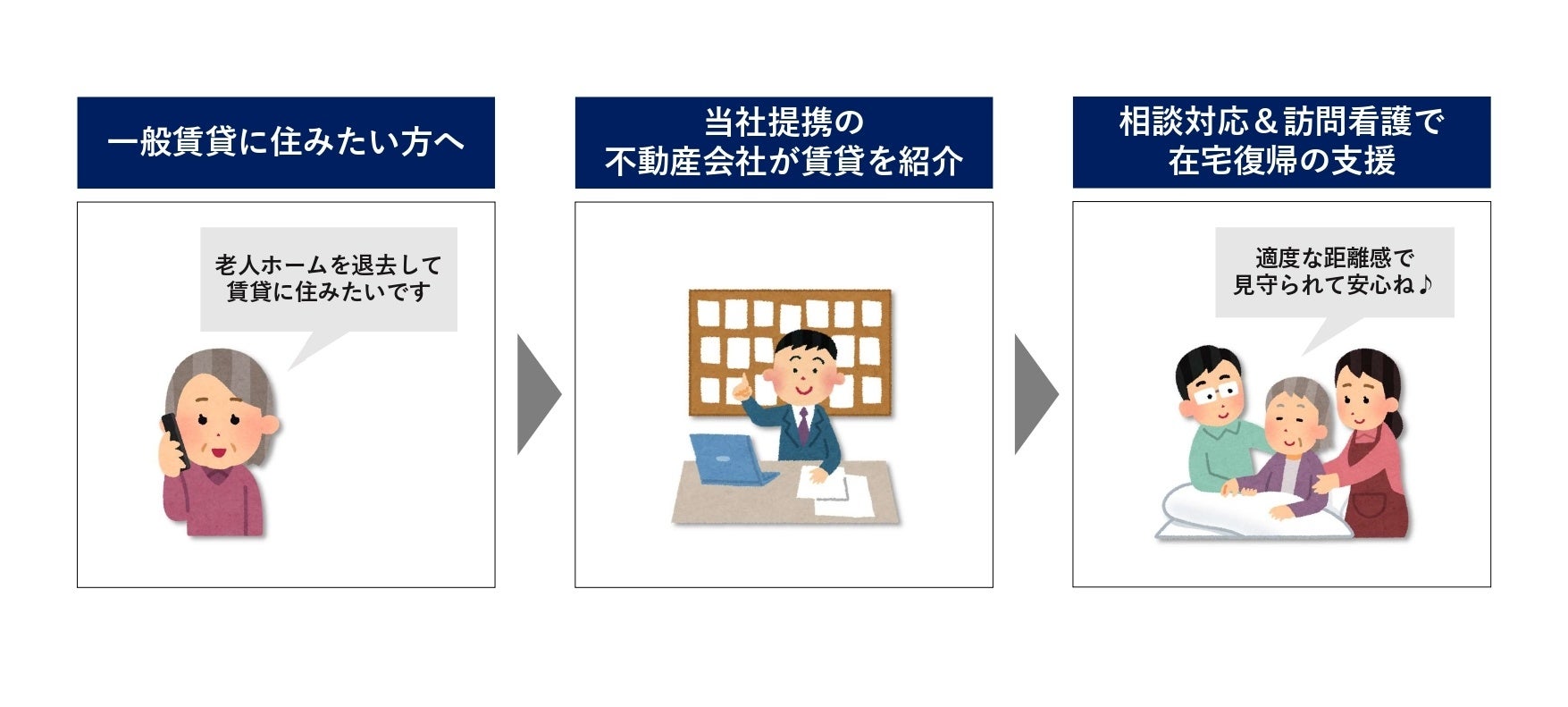 また当社は「訪問看護に週数回入れば、孤独死リスクが大幅に低減する」というコンセプトを地元杉並区中野区練馬区を対象とする不動産賃貸会社様や大家様にお伝えをし、不動産物件の供給数を日々増やしています。