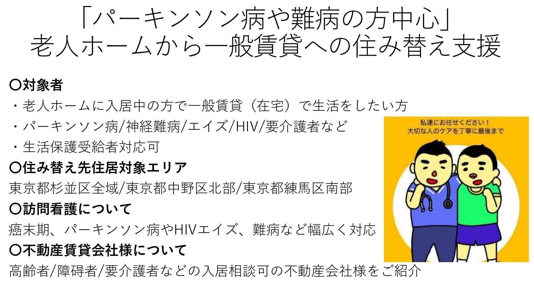 この度は、より難易度の高いパーキンソン病・神経難病・エイズやHIVを中心に「老人ホームに入居はしたけれども、在宅で生活をしたい」という皆様のご支援を行います。