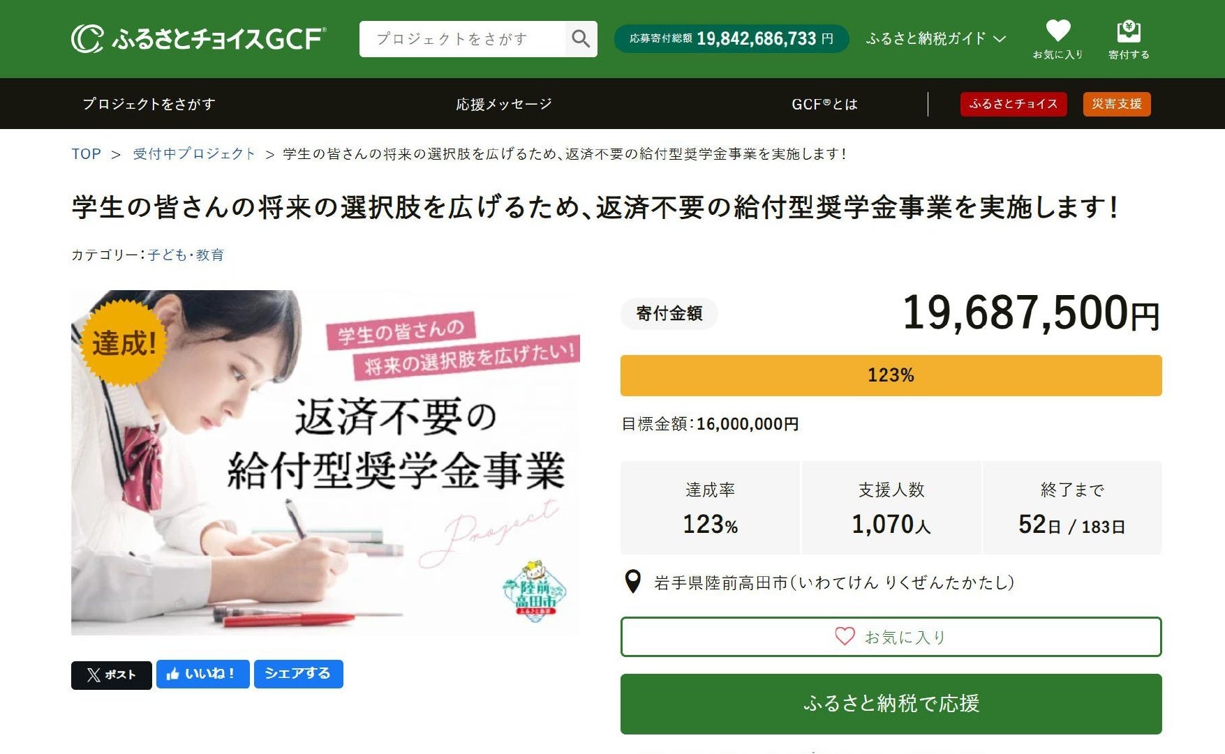 【岩手県陸前高田市】は、8月2日よりふるさと納税総合サイト「ふるさとチョイス」を企画・運営する株式会社トラストバンク(本社:東京都品川区、代表取締役:川村憲一、以下「トラストバンク」)が提供するクラウドファンディング型でふるさと納税を募る仕組み「ガバメントクラウドファンディング®」(以下GCF®)で、【返済不要の給付型奨学金の運用資金を募る】プロジェクトを実施しており、12月1日、目標金額の1,600万円を達成しました。目標金額は達成しましたが、募集期間内は引き続き寄付を受け付けます。