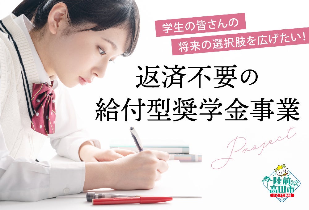 陸前高田市出身の大学生や専門学校生等を対象に、入学時に20万円の一時金を給付し、奨学金は月額3万円を給付するなどの給付型奨学金制度の資金に活用します。