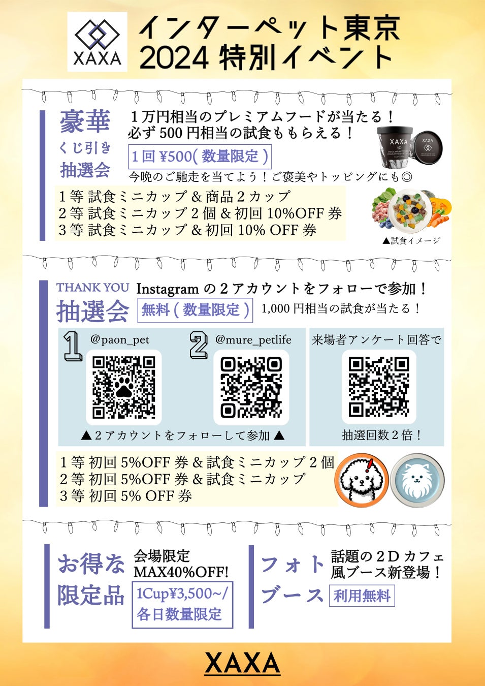 XAXAは、愛犬や愛猫の健康を第一に考え、レストラングレードの新鮮かつ高機能なペットフードを提供することで、ペットと飼い主の両方にとって至福の時間を提供するブランドです。インターペット東京での出展を通じ、XAXAは最新商品や国内で人気のメニューを特別価格で提供いたします。数量限定の特別販売なので、この機会をお見逃しなく。