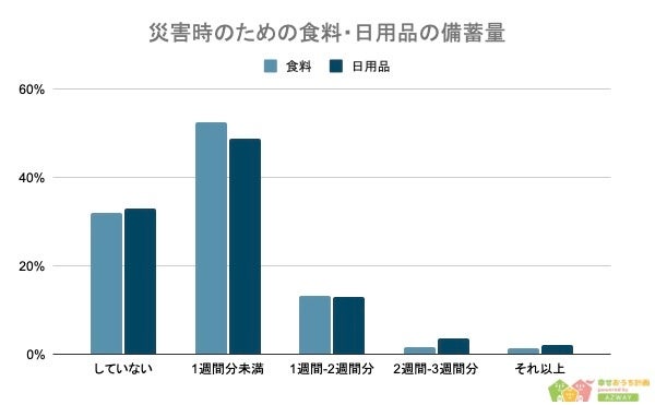 また、同様に「日用品の準備」について聞いたところ、1位が「1週間分未満くらい(48.8%)」、2位が「していない(33%)」、3位が「1週間〜2週間分くらい(12.8%)」という結果になっており、食品・日用品ともに同程度の備蓄であることがわかります。