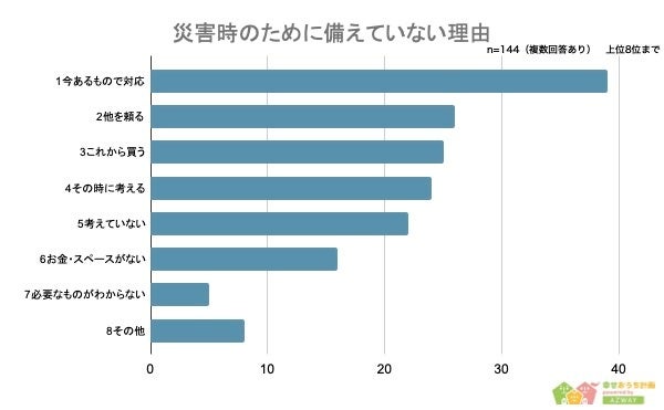 最後に、災害時の準備をしていない人144人に「理由」について聞いたところ、1位が「今あるもので対処する(39人)」、2位が「他を頼る(26人)」、3位が「これから買う(25人)」という結果になりました。