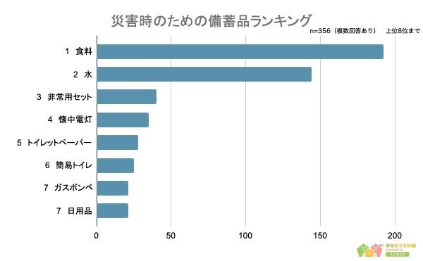 続いて、災害時の準備をしている人356人に「何を準備しているか」について聞いたところ、1位が「食料(192人)」、2位が「水(144人)」、3位が「非常用セット(40人)」という結果になりました。