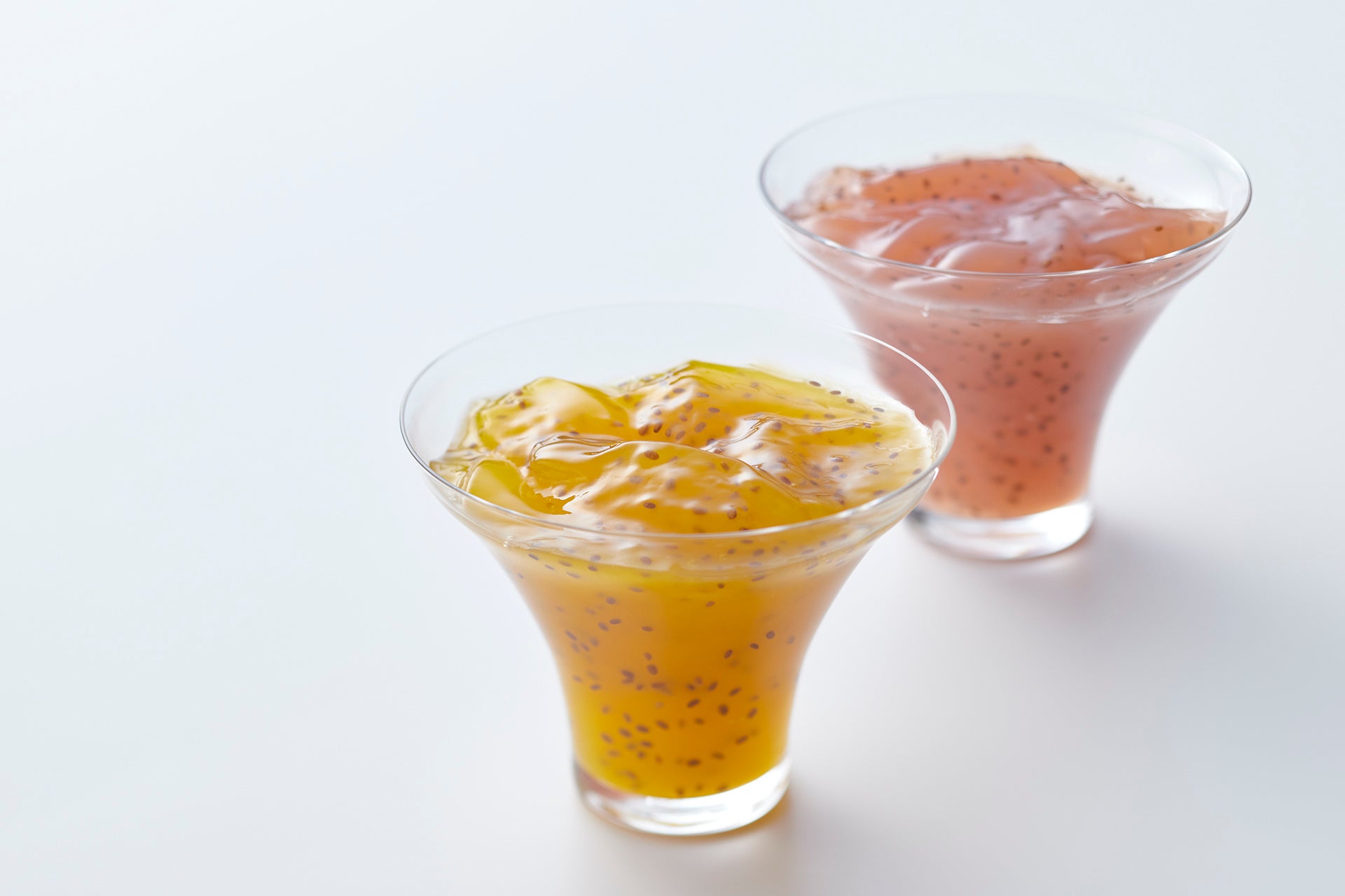 昨年10年ぶりにリニューアルした「リュリュ」は南国の果実が持つ自然の色や味わいを活かし、暑い季節でもさらりとお召し上がりいただける一品に仕上げています。また、チアシードをたっぷりくわえたことでプチプチとはじける食感も楽しいゼリーです。