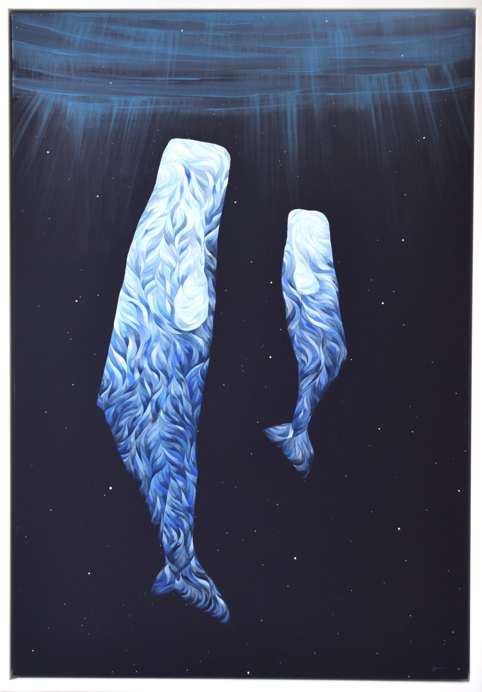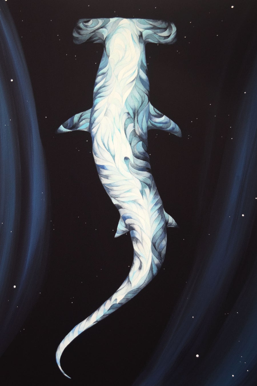 新作のハンマーヘッドシャークは、AMATORA SPAのキーカラー濡烏(ヌレガラス)色を夜の海に見立て月の光がオーロラのように差し込み、しなやかな流れ星のように通り過ぎていく、揺れる美しい様を描き上げています。