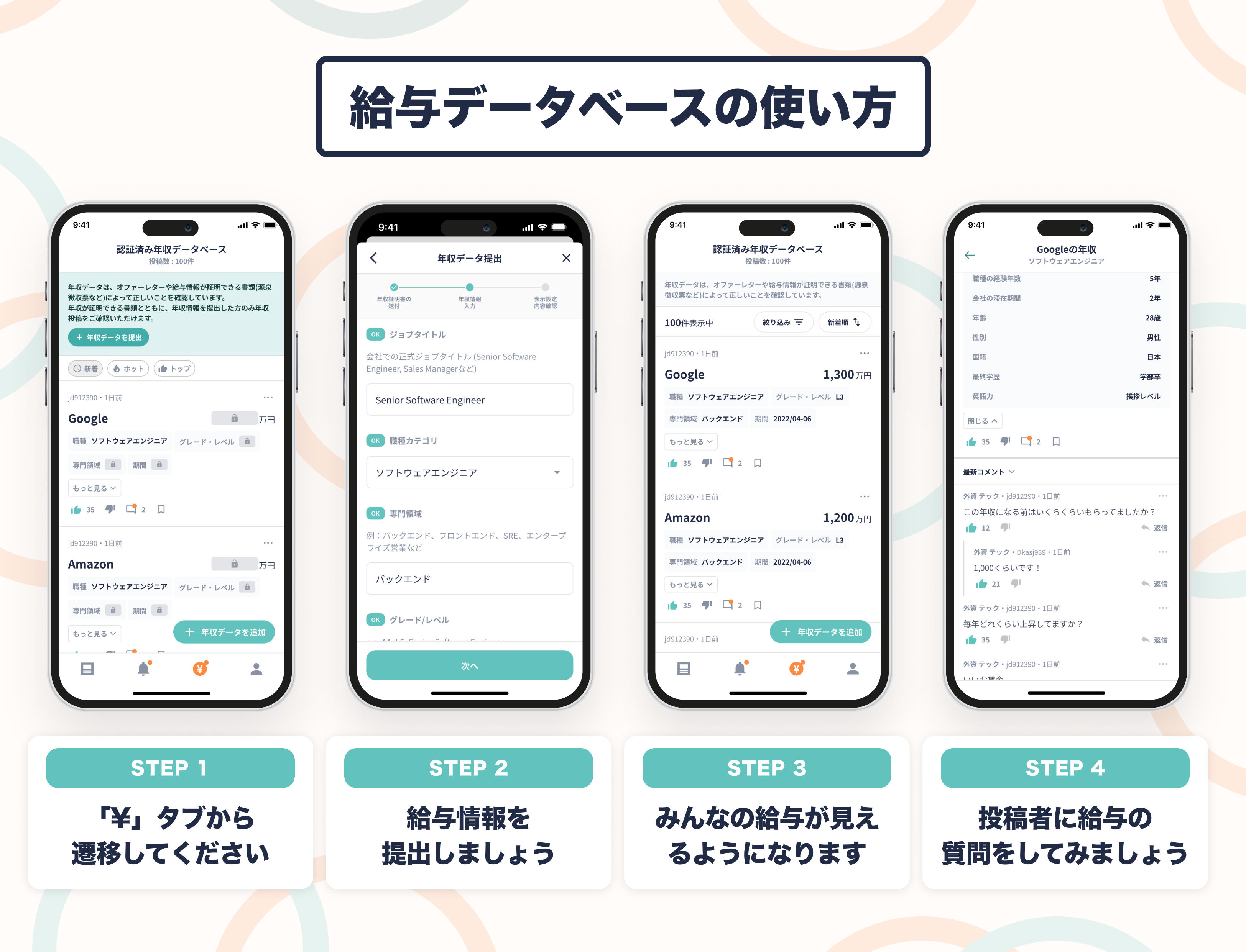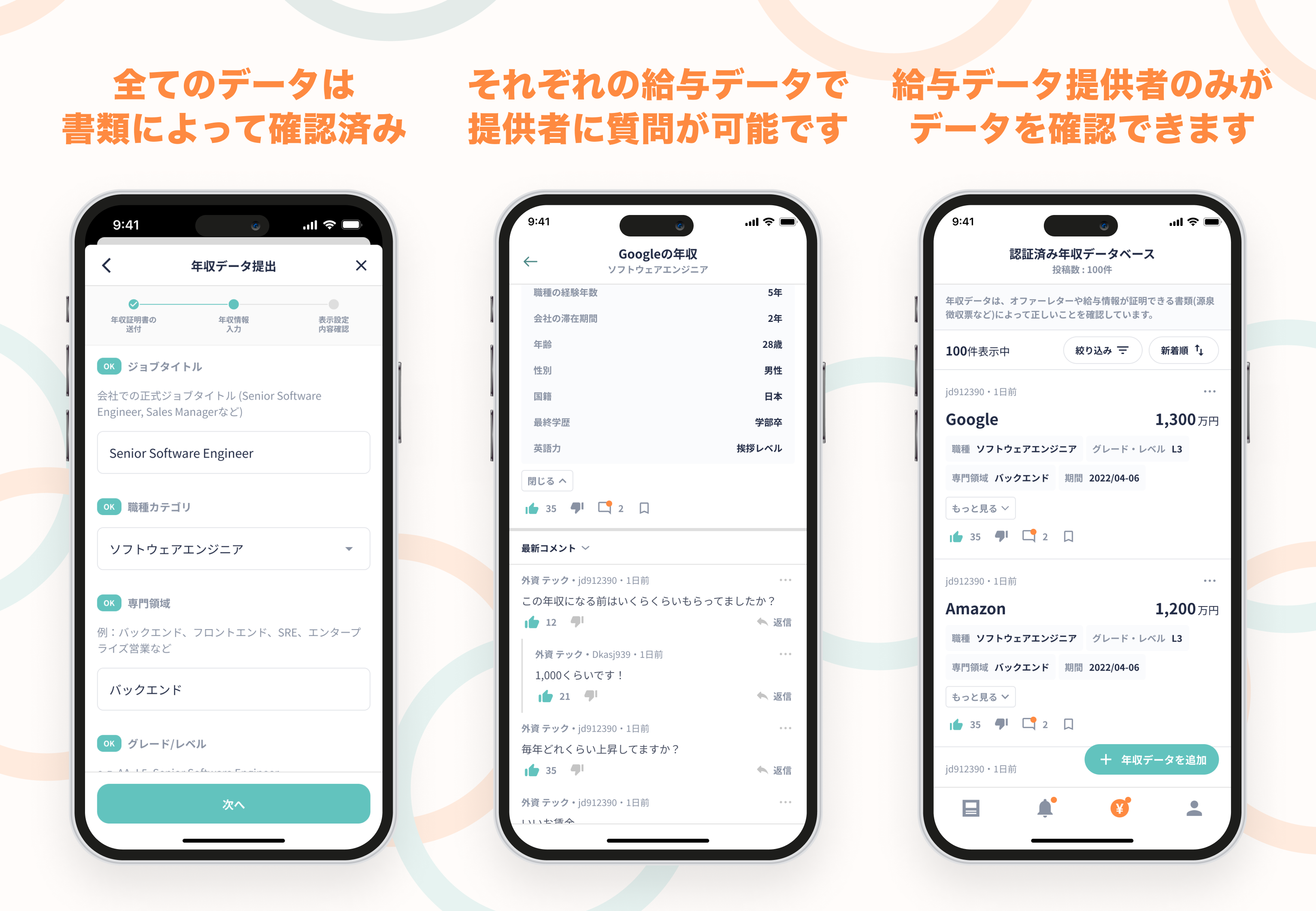 証明済み給与データベースの特長として、情報提供者に匿名で質問をすることが出来ます。どのようにして、今の給与水準までもっていったのか、キャリア構築の方策について等、コメントでやり取りすることが可能です。