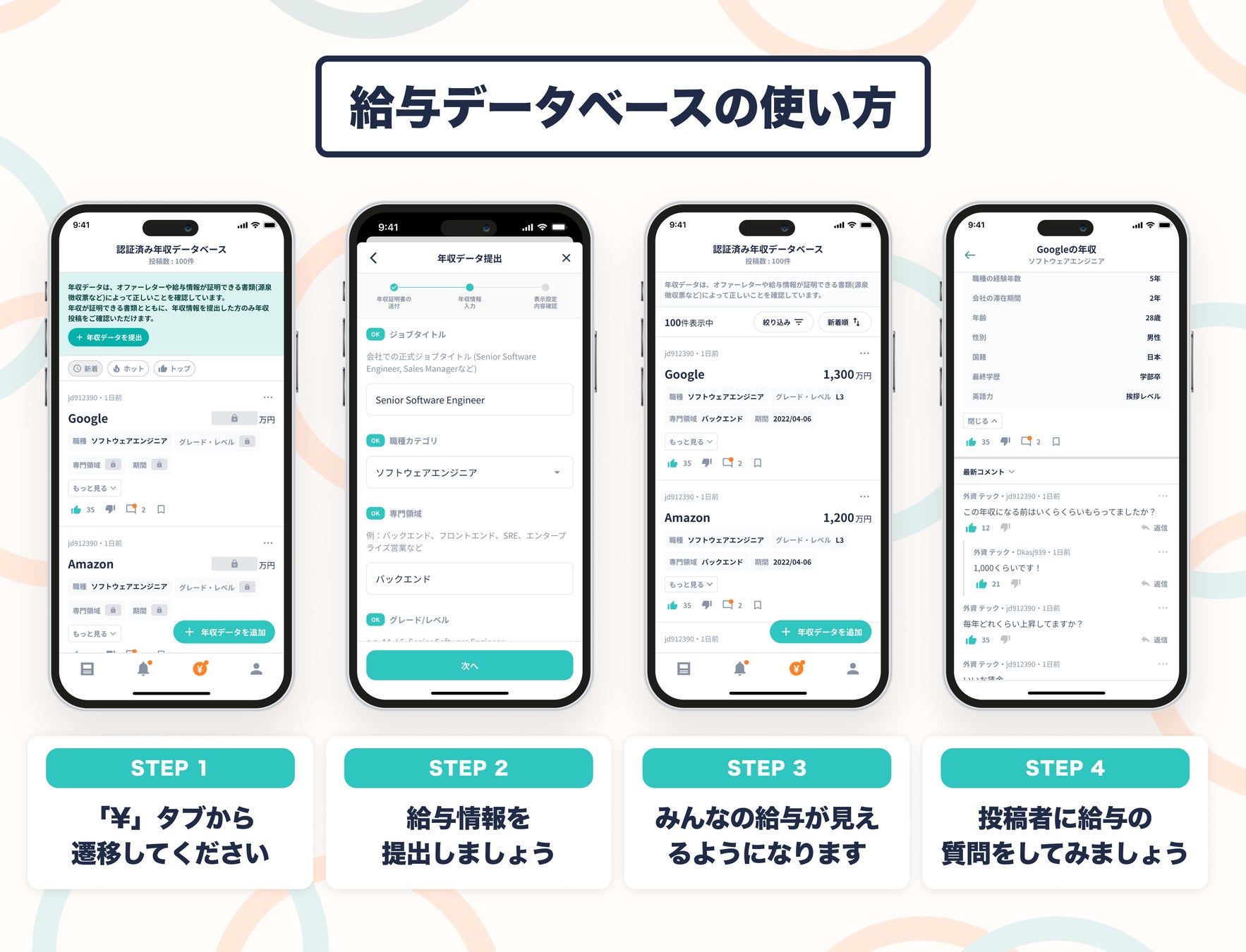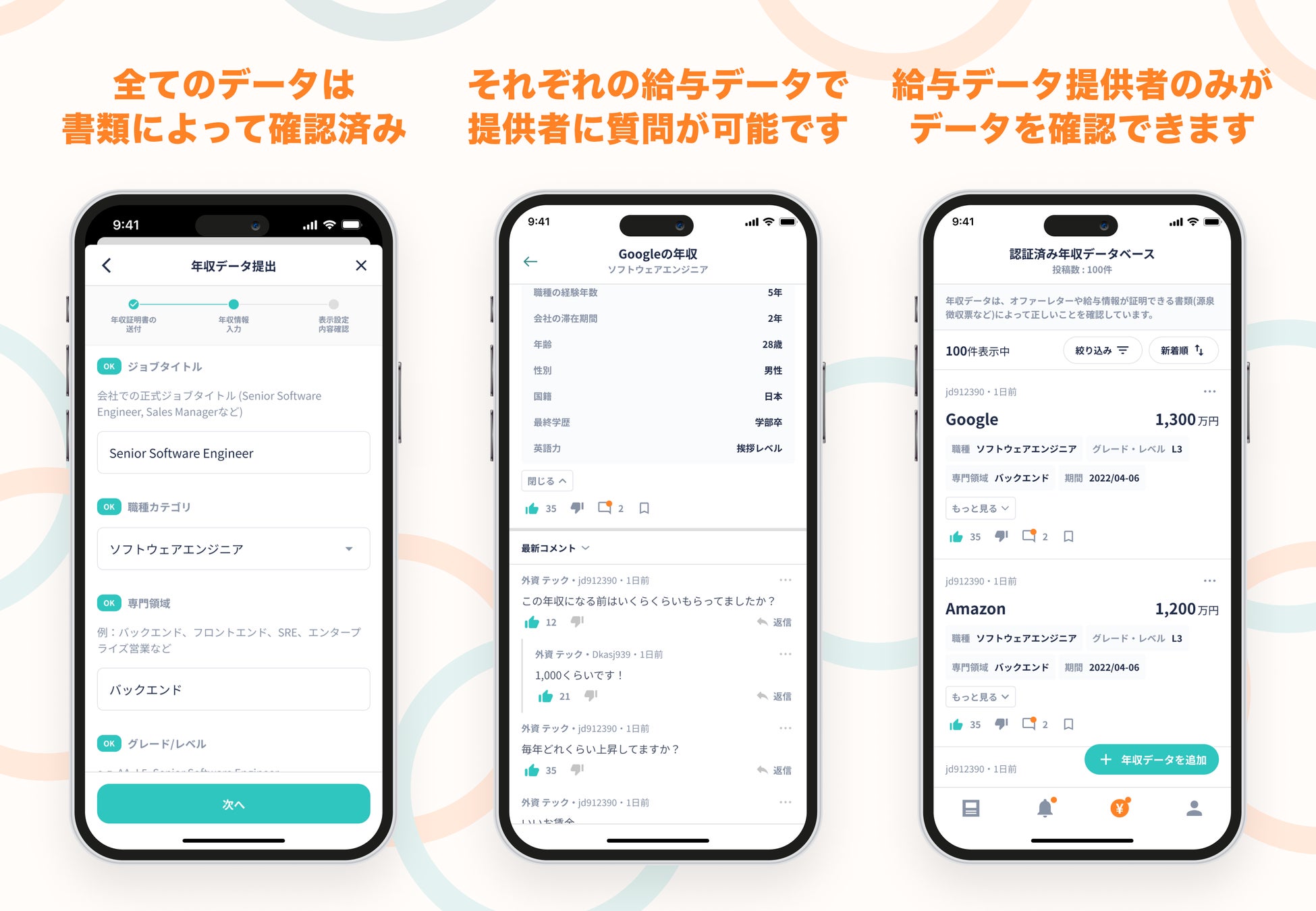 今後は業界内で自分が、社内もしくは同じ職種内で、上位何%に位置するのか確認する機能や、各社の給与の上がり幅トレンド、興味ある会社の給与の上がり幅等を知ることが出来るように想定しています。日本一精度と粒度の高い給与データベースを目指して参ります。さらには給与のみにとどまらず、会社の評判や面接対策など多角的な視点で精度の高いキャリア情報を提供していく予定です。