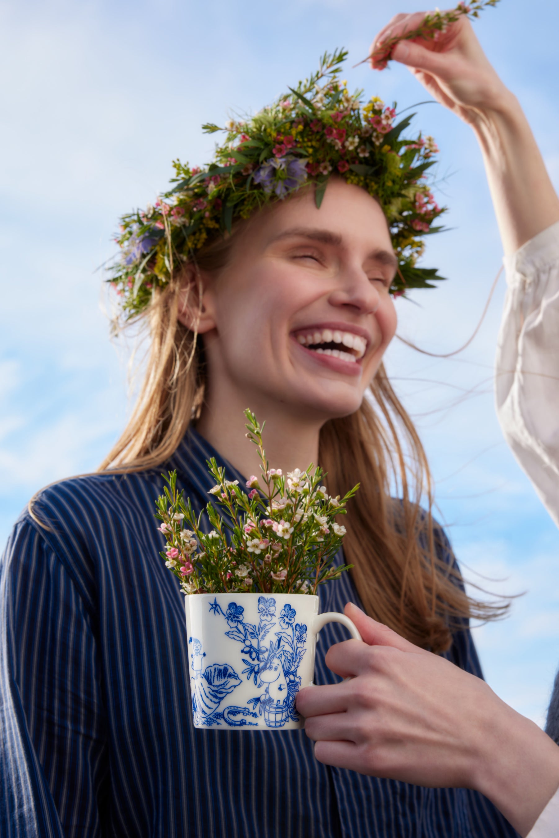 今年のマグは1965年に発表されたムーミンの最後から2番目の小説「ムーミンパパ海へいく」を題材にしています。この物語のなかで、ムーミン谷の平和すぎる毎日のなかで自分が必要ない存在になってしまったとムーミンパパが感じたことから、ムーミン一家は安全で慣れ親しんだムーミン谷から遠く離れた、自然に囲まれた灯台のある島に引っ越します。もともとヤンソンがファンへの返信用の便せんに描いていたイラストのトーンをもとに、トーベ・スロッテがアレンジしたデザインのマグには、島の海岸で過ごすムーミン、ムーミンママ、ムーミンパパ、ちびのミイが描かれています。スミレや野ばら、サジーや貝殻など風光明媚な島の風景とともに、シンプルな白地にインクを想起させる鮮やかなブルーの色で表現されており、爽やかな潮風が吹き抜けるようです。