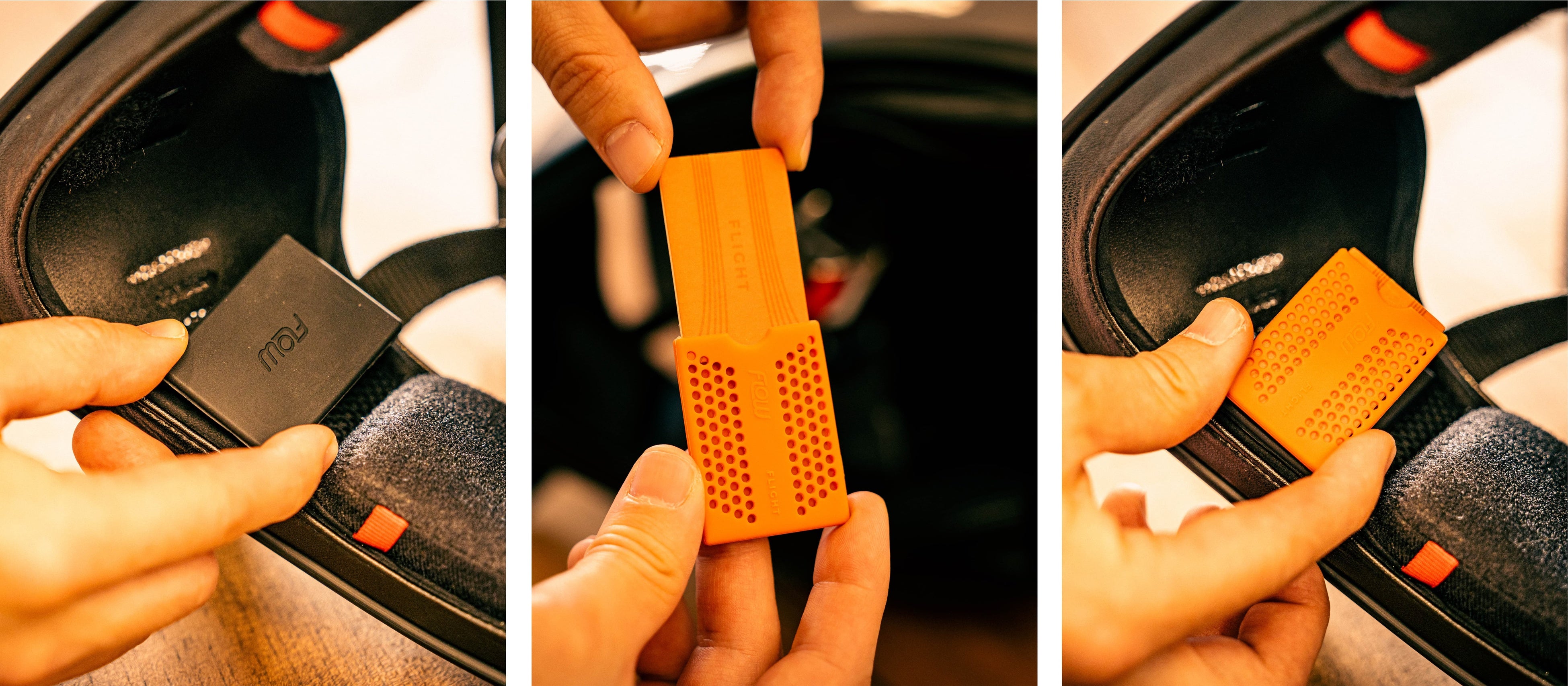 先ほどディフューザーをセットしたホルダーを、ヘルメットに貼り付けたベースプレートに取り付けるだけ。内蔵されたマグネットにより、簡単に脱着することが可能。キャノピーとフライトの2種類をお持ちの方は、その日の気分に合わせて自由に付け替えることができます。