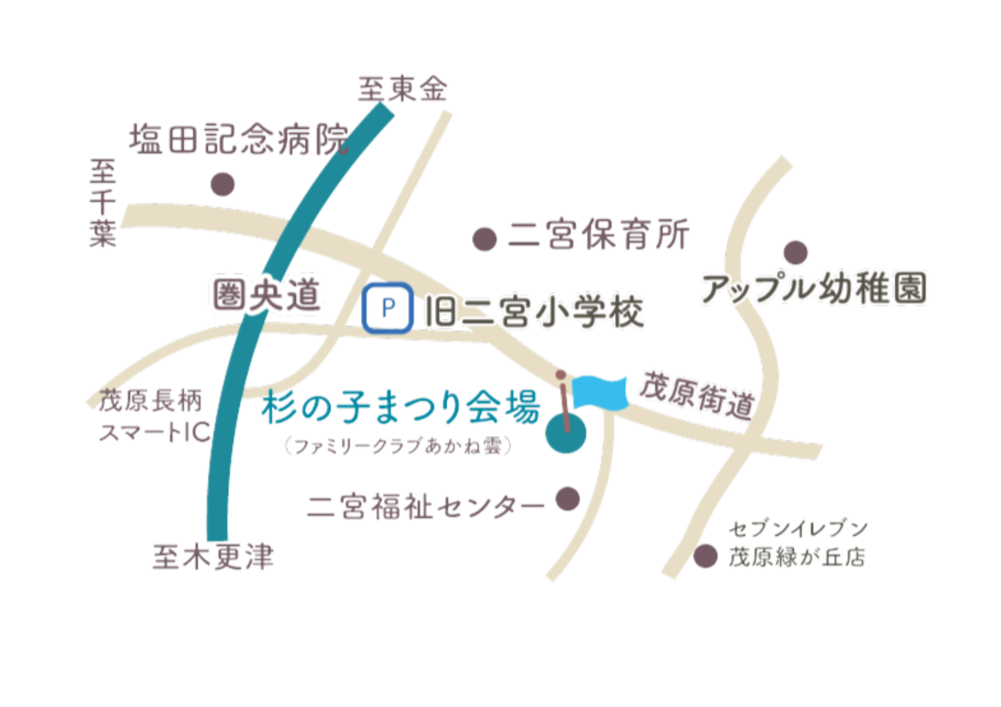 (P1)旧二宮小学校 (P2)アップル幼稚園 ※駐車スペースには限りがございますので、できる限り 乗り合わせや公共交通機関をご利用ください。 |
