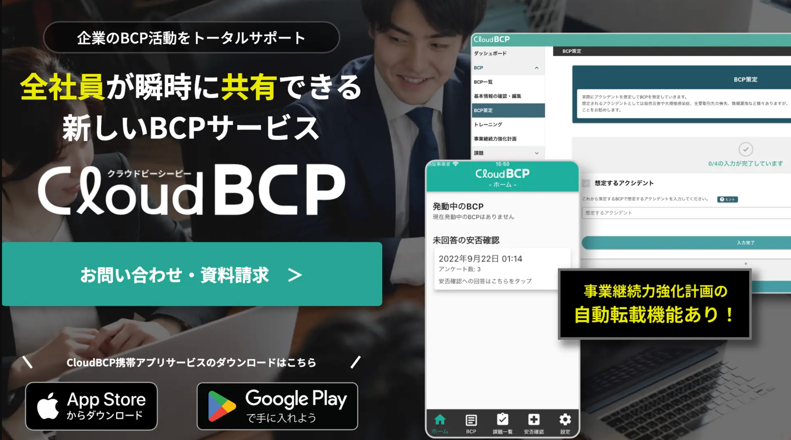 CloudBCPは、企業のBCP(事業継続計画)を、策定、緊急連絡、運用までトータルサポートするSaaSです。本来BCP策定はコンサルタントとともに半年から1年かけて行うものですが、15分で簡単策定。トレーニング機能を通してPDCAをすばやく回して改善することで、贅肉のないしなやかなBCPを大量に作ることができます。その他企業のアクシデント対策に必要な機能を包括的に搭載し、BCP活動をワンストップで行うことができます。