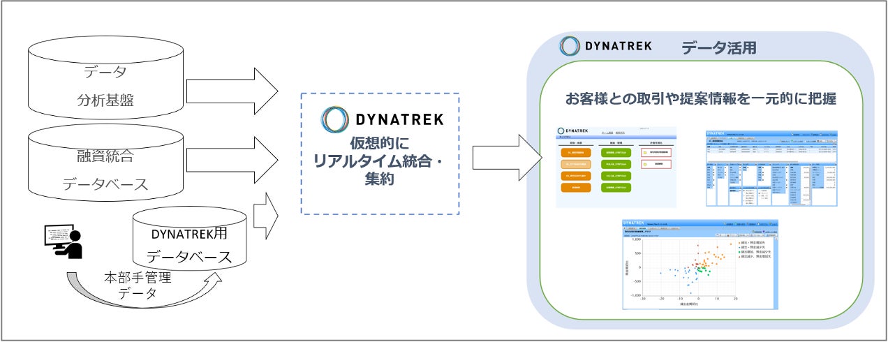 山陰合同銀行では、中期経営計画で戦略分野と位置付けるDX分野において「データの利活用」を推進し、全行的にデータが共有・可視化され、その利活用が浸透するよう取り組みを進めています。今般、この取り組みの一環として、DYNATREKにより、お客様との取引内容や提案の状況などさまざまなデータを一元的に把握できる仕組みを構築しました。これにより、同行はお客様ごとのニーズに即した適切な提案を行うとともに、お客様からのお問い合わせなどに、より迅速に対応していきます。