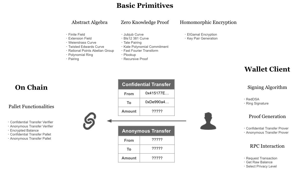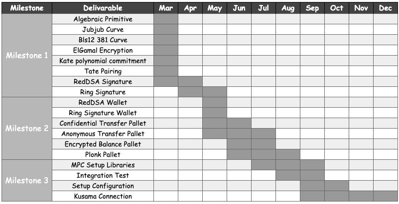 これまでに4度、ゼロ知識証明と準同型暗号に関わるWeb3財団のグラントに取り組んできましたが、それらの経験を組み合わせることで本プログラムではスケーラブルなプライバシー保護の送金を実装し、最終的にはPolkadotに接続することを目標としています。