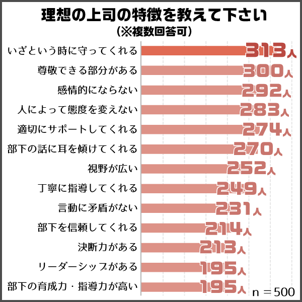 その反対に理想的な上司とは、どの様な特徴を持っているのでしょうか?「理想の上司の特徴を教えて下さい」と尋ねると、第1位は「いざという時に守ってくれる」でした。