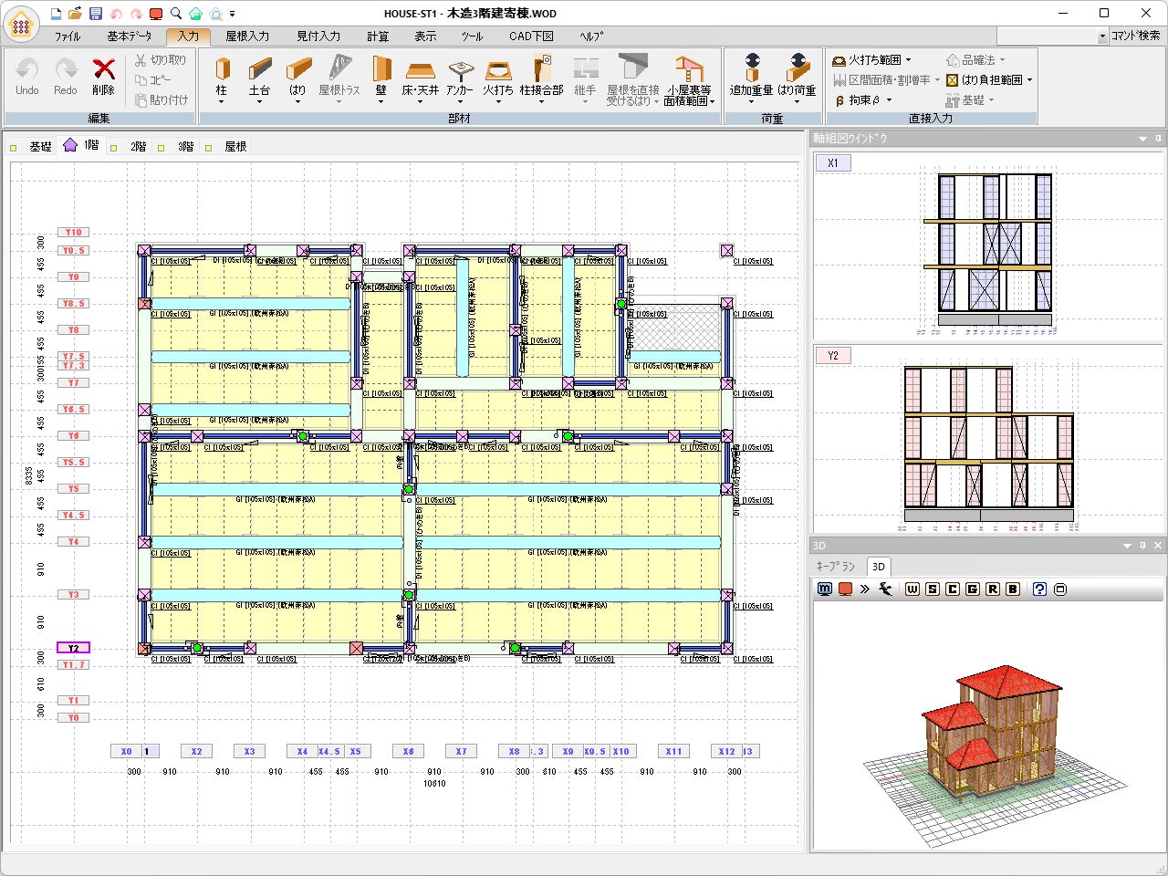 HOUSE-ST1は、木造軸組工法の構造計算を行うソフトウェアです。計算した結果は、伏図などと共に構造計算書として出力されます。3階建てのほかに、2階建て以下、最下階RC/S造、2階、2・3階木造の立面混構造に加えて、1・2階RC/S造、3階木造の立面混構造の木造部分の構造計算が行えます。