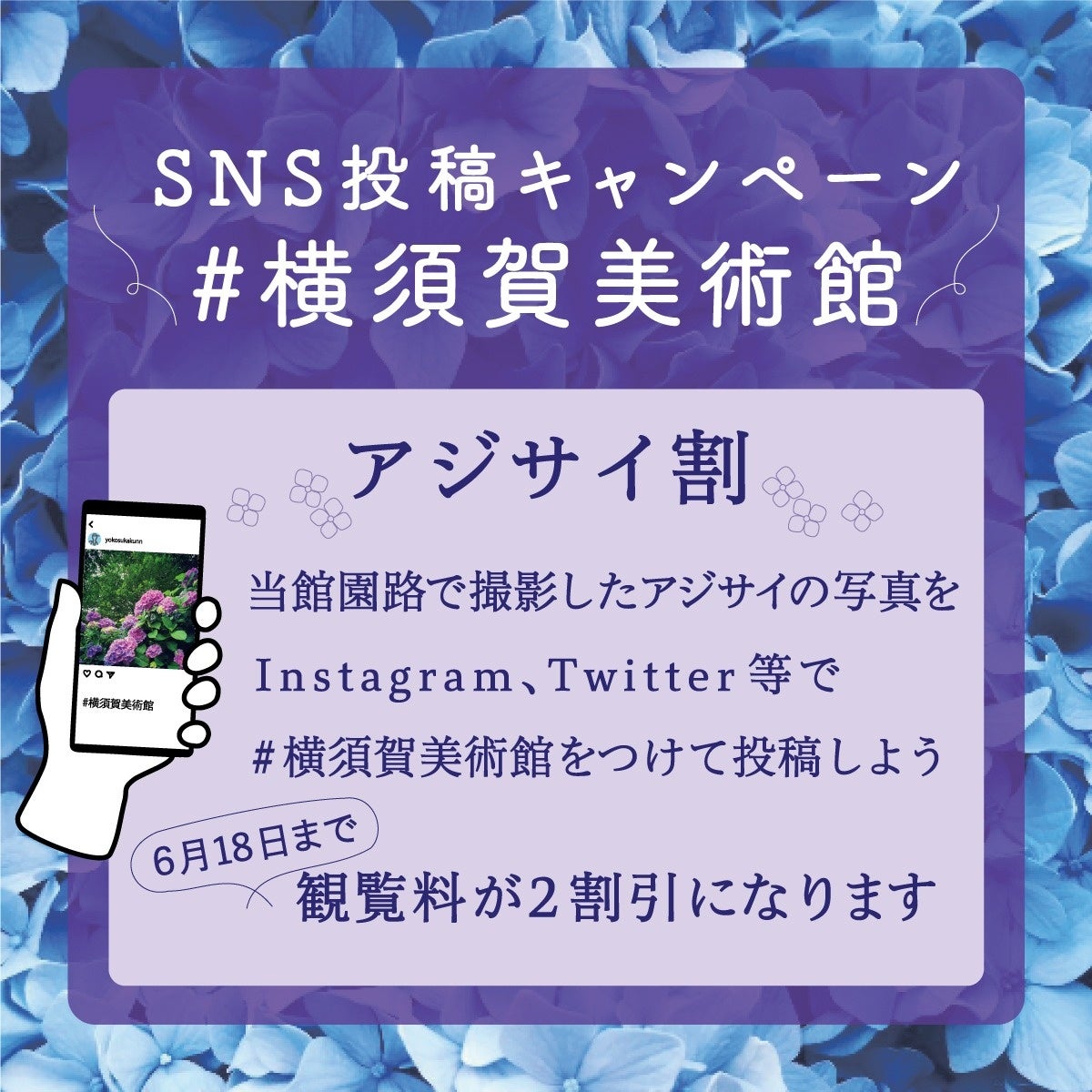 現在開催中の企画展「没後40年 朝井閑右衛門展」会期中に、横須賀美術館園路のアジサイを撮影して、Instagram、Twitter、Facebookで、「#横須賀美術館」をつけて投稿した画面を受付スタッフに提示で、観覧料を2割引いたします。(キャンペーン期間:令和5年(2023年)6月18日(日)まで)