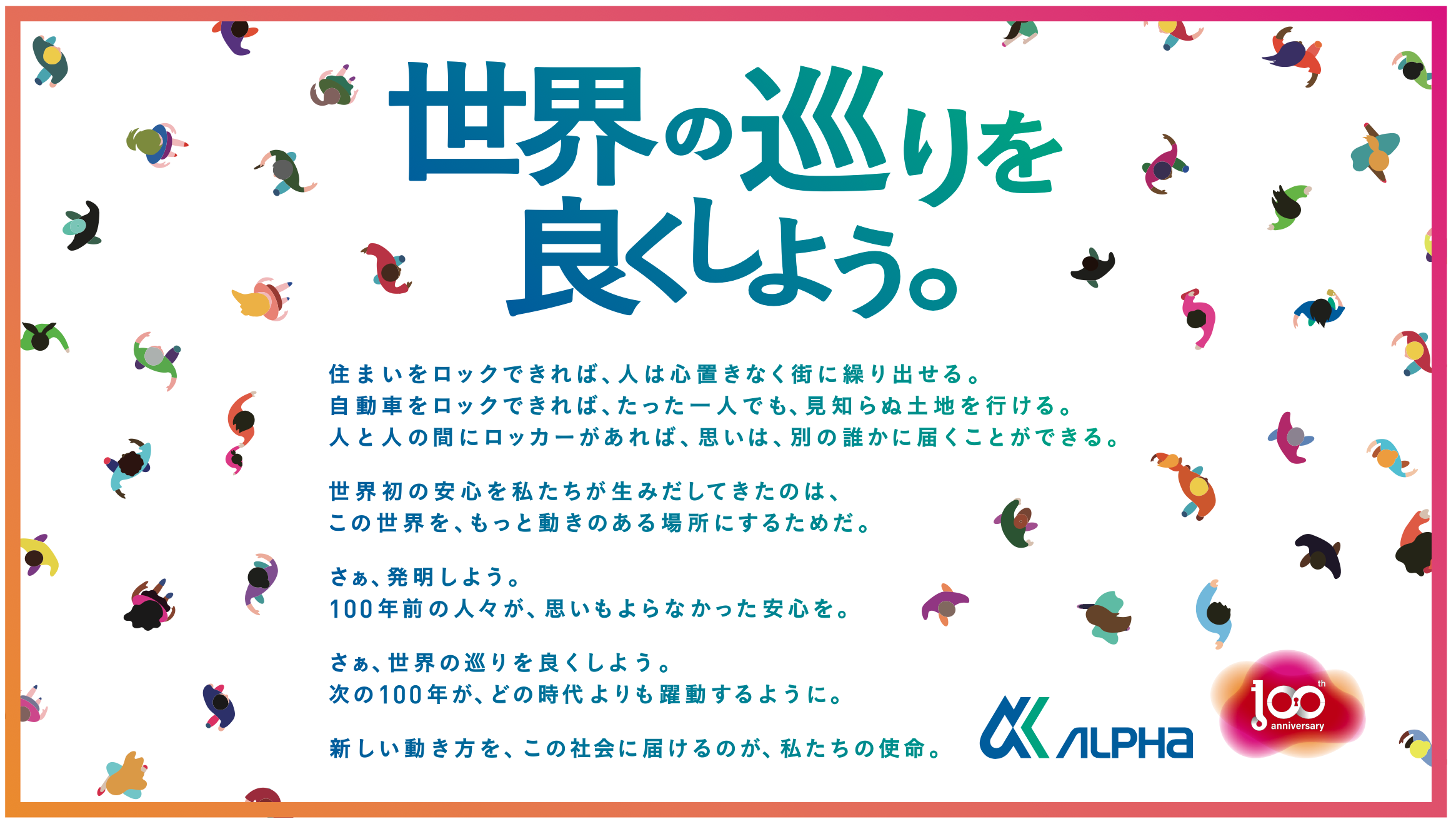100年前、たった一部屋の小さな工場で住宅の錠前という小さな「安心」を作り始めたアルファが、今では国内外に20 社のグループ会社を持つ企業へと成長し、住設機器事業のみならず自動車部品事業、ロッカーシステム事業と幅広い分野において多くの皆様に「安心」をお届けすることができるようになりました。そしてこの「安心」が人を動かし、モノを動かし、世界を巡らせています。
