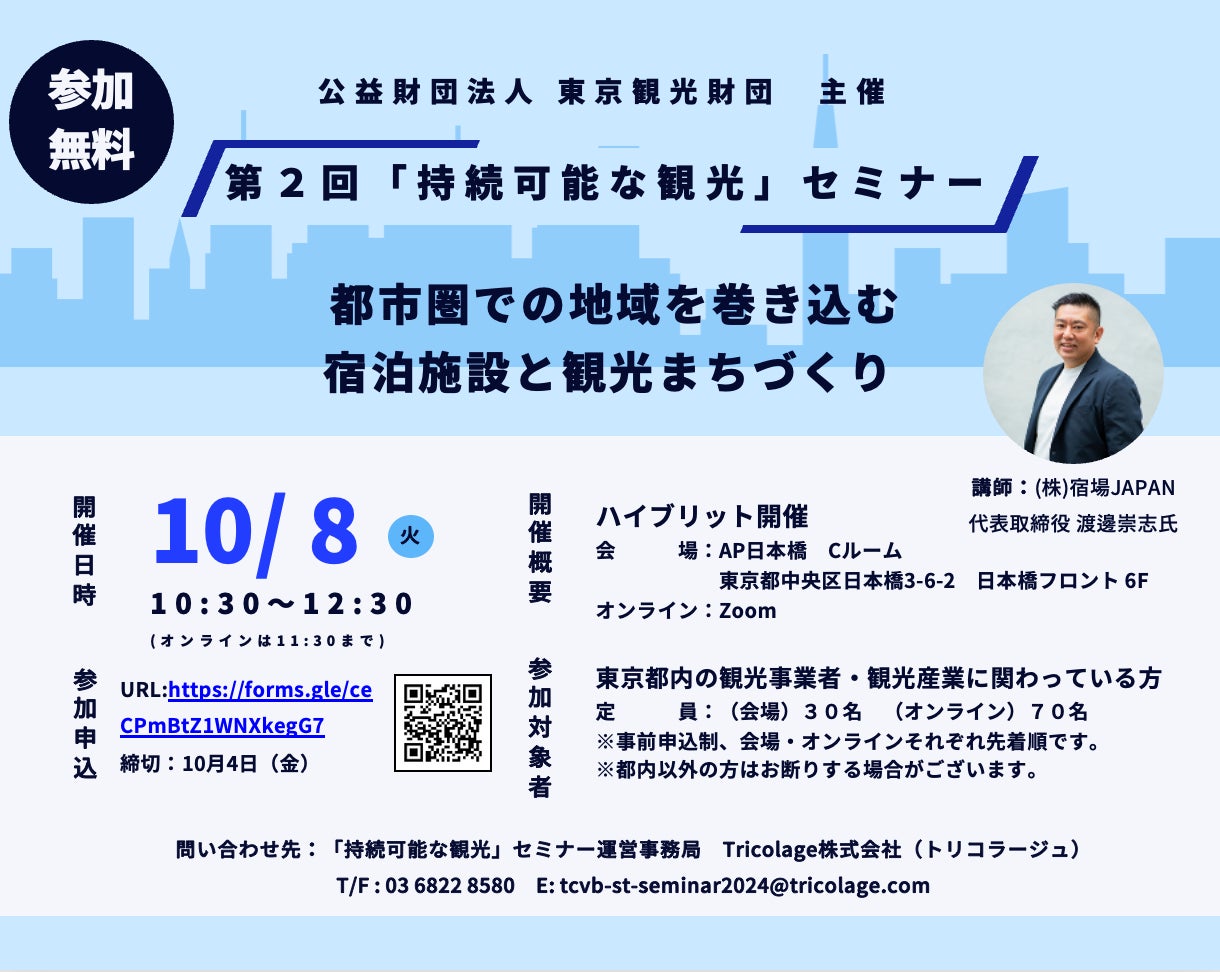 10月8日(火)東京都内観光事業者対象セミナー開催!都市圏での地域を巻き込む宿泊施設と観光まちづくり