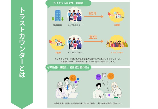 Trustカウンター事業では、多くのフォロワーを抱える建築関連の投稿をしているインフルエンサーや工務店営業に精通した営業担当者を紹介いたします。そのため、お客様は時間や労力の負担をかけずに、自社の商品やサービスの認知度を上げることができます。加えて、自動的に見込み客を獲得することができるのはTrustカウンター事業の最大の魅力になります。