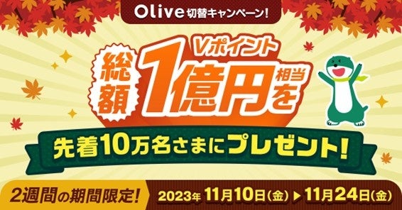 株式会社三井住友銀行(頭取CEO:福留 朗裕、以下「三井住友銀行」)は、すでに三井住友銀行口座をご利用されている皆様に日頃のご愛顧に感謝を込めて「~総額1億円相当のⅤポイントを先着10万名さまにプレゼント!~Olive切替キャンペーン」を11月10日(金)から11月24日(金)の期間限定で実施いたします。