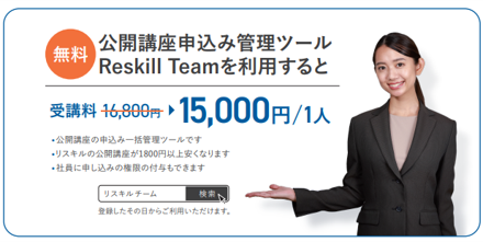 リスキルのミッションは「一人でも多くの人に研修を届ける」ことだからこそ、リスキルのオンライン研修「公開講座」は、1人16,800円ですべてのビジネス研修が受けられるリースナブルな金額設定を実現しました。