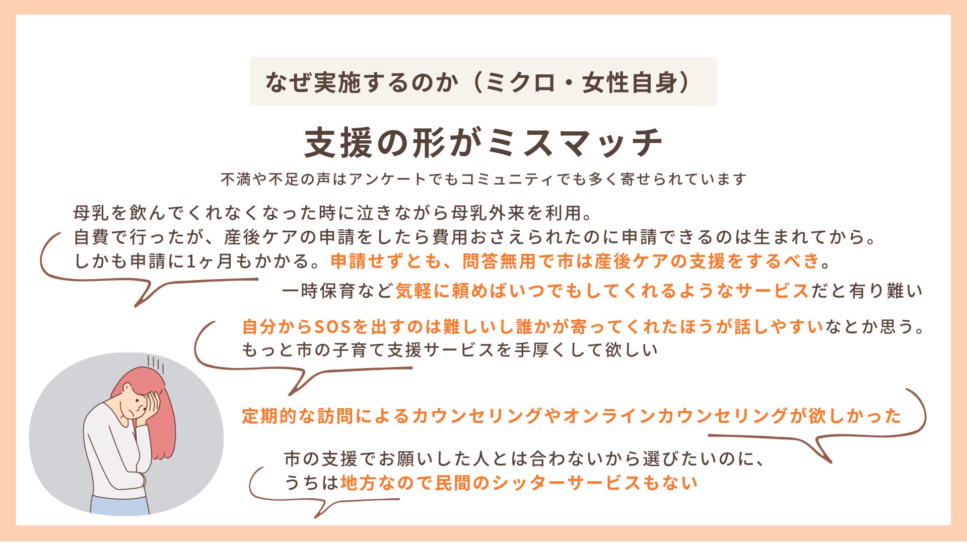 そこで、100名規模のアンケートを複数回行い、産後うつやその状態に近い女性とその女性を支える男性両方の声を集めたところ、実際に行政へ相談に行った人は4名しかおらず、「家族に相談して終わってしまっている」「どこに相談すればいいのかわからない」という実態がわかってきました。包括支援は何年も前から進められていて、産後ケア事業も政策として動き出し予算が増えています。それでも何が足りないのでしょうか?そこを考えるために企画しました。