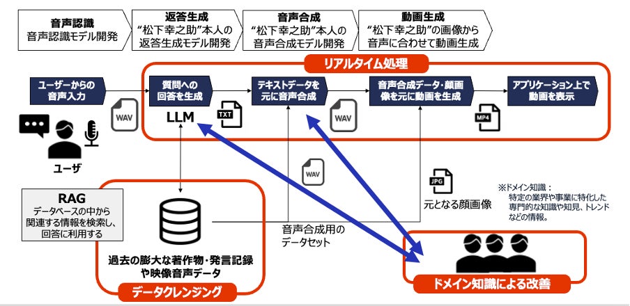 具体的には、過去の膨大な発言記録をもとに構築した返答生成モデル、音声合成モデルを通して、松下幸之助氏らしい語り口調と表現力を実現しています。また、音声データには独自のクレンジング処理を施し、ノイズ除去や昔ながらの言い回しの適応を行うことで、より高い精度の音声合成が可能となっています。さらに、松下幸之助研究者や同氏の薫陶を受けた専門家から、出力結果への評価・フィードバックを得ることで、AI返答内容の質を向上させ、同氏の理念を継承できる「松下幸之助」再現AIを実現しました。(図2)