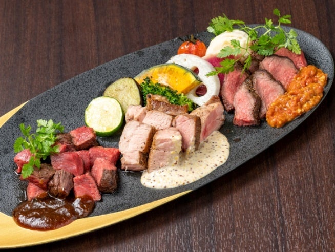 贅沢感のある、和牛イチボ、和牛芯玉カブリ、松阪豚肩ロースの3種を盛り合わせた当店一番人気メニュー。 強火のフライパンで両面をカリッと焼いた後ブランデーでフランベし、一度休ませた後オーブンでじっくりと火入れをします。9種類のソースからお好みの3種をお選びくださいませ。