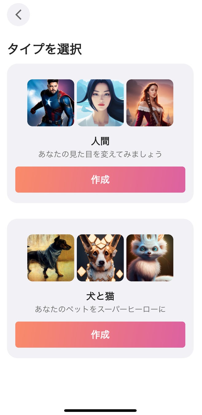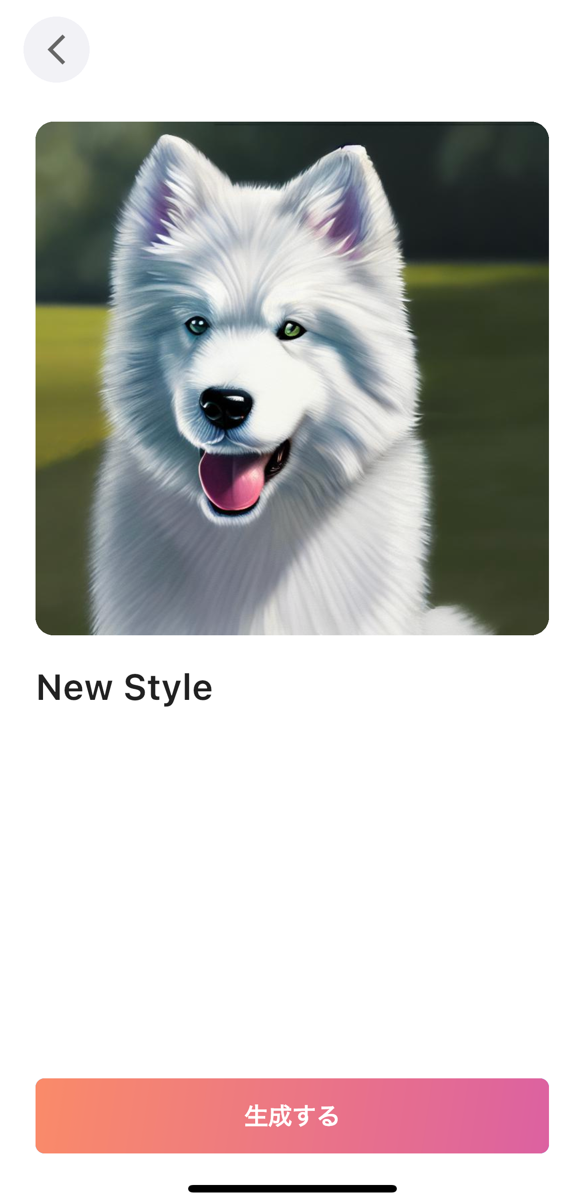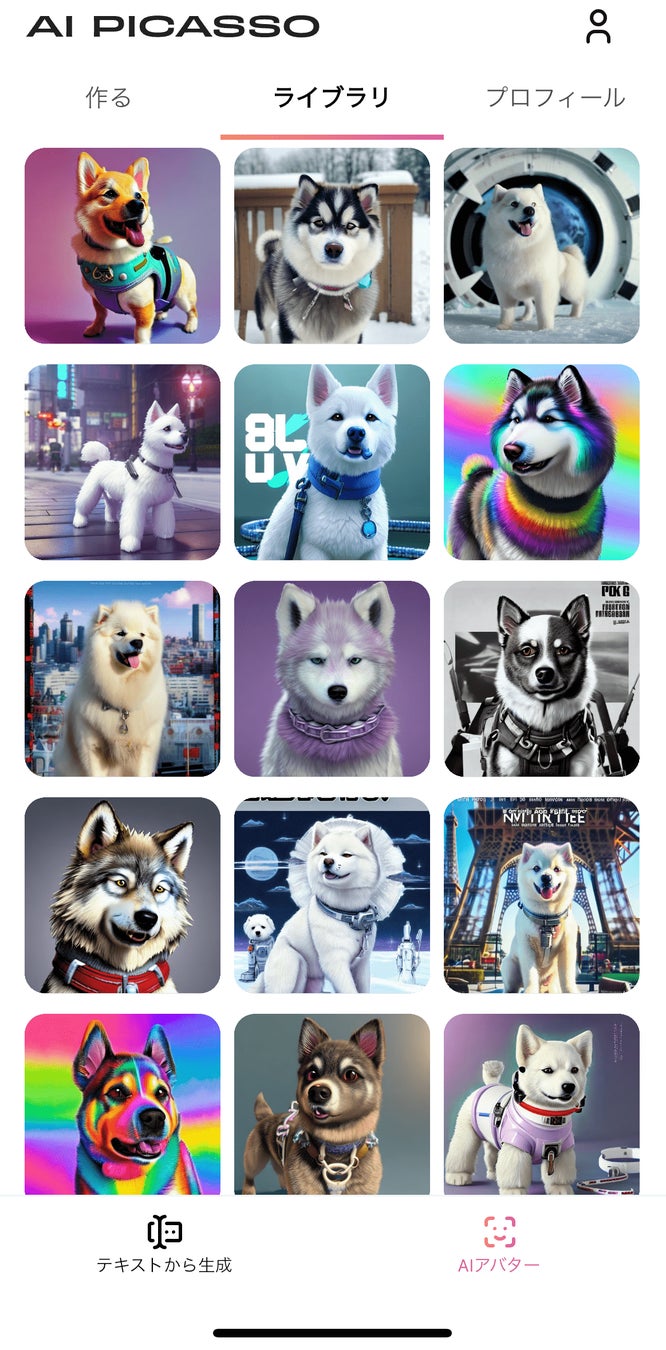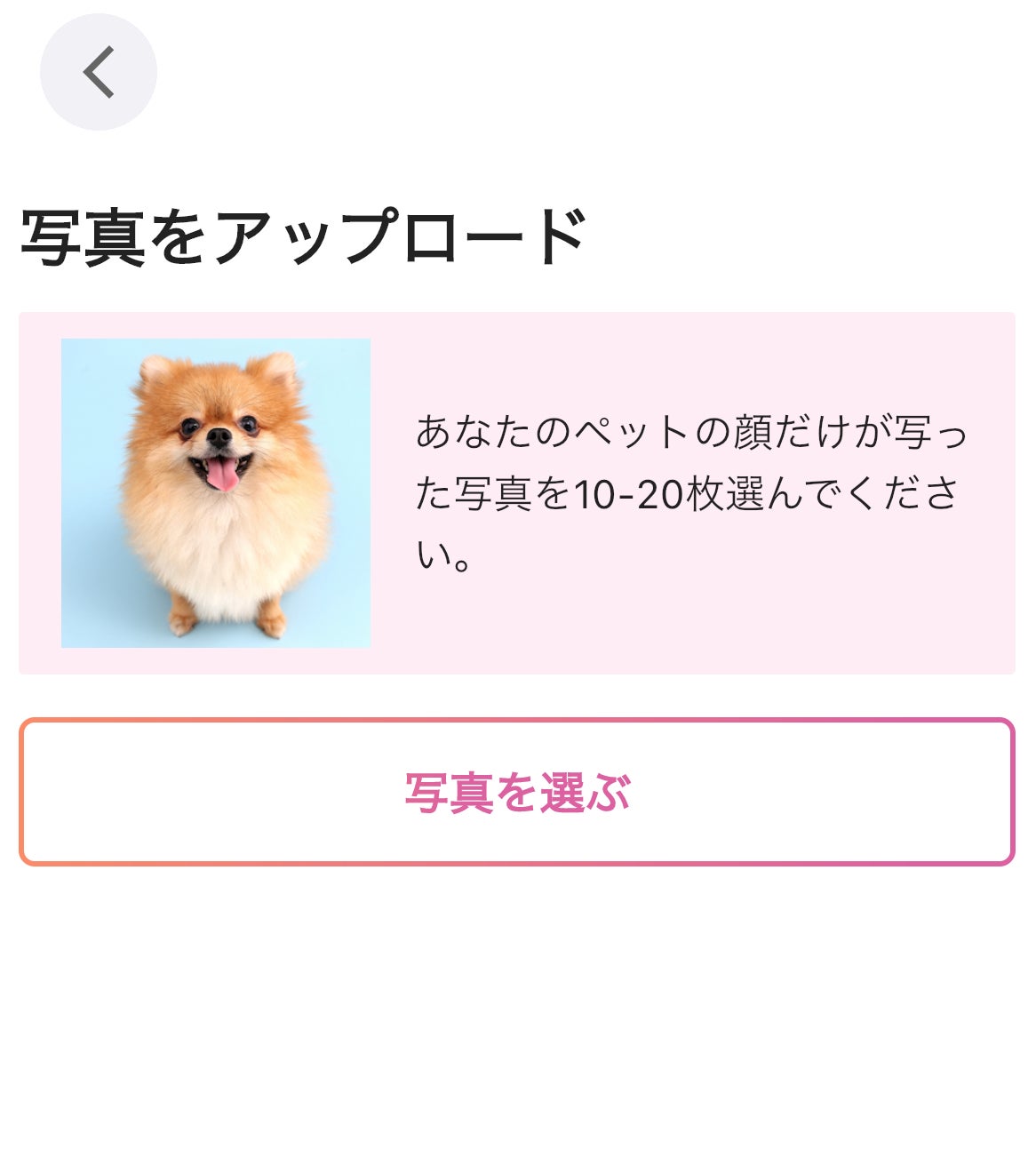 あなたのペットの顔が写った写真を10~20枚アップロードして、「生成する」をタップします。
