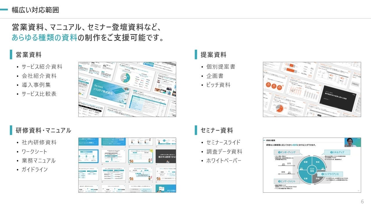 さまざまな資料制作支援実績のあるコンサルタントと、資料作成特化コミュニティ「シリョサク!ラボ」で鍛えたデザイナーがチームを組んでサポートします。