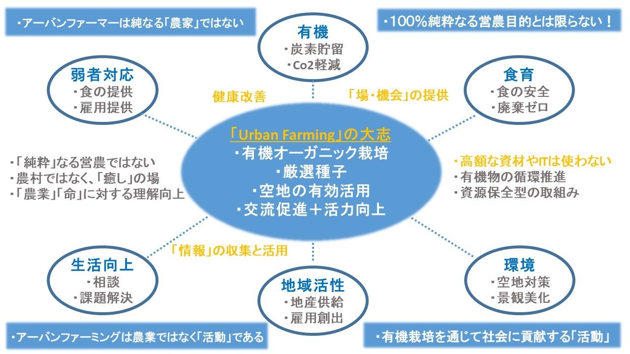 私たちが想定するアーバンファーミングとは都会におけるビルの屋上や植物工場での野菜栽培に特化するものではなく、都市部や市街地、里山に増えている空き地や空き家を有効活用し、近隣住民が集い交流を持つことができる拠点作りであり、寄り添える「場」の提供です。そのような「場所・菜園」から生まれてくる住民交流や弱者支援、子供食堂支援などを含めた地域協働体制の提唱ができればと願っています。