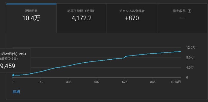 過去実績では9000再生分をGoogle広告システム経由で推し広告して以降、おすすめや検索流入比率が大幅に増加し、10万再生を突破したものもあります。現在では全体の9割がおすすめや検索結果からの流入になっており、たった一つの動画で4000時間以上の再生数(収益化ライン)と1000人近くの登録者を獲得することに成功した事例もあります。