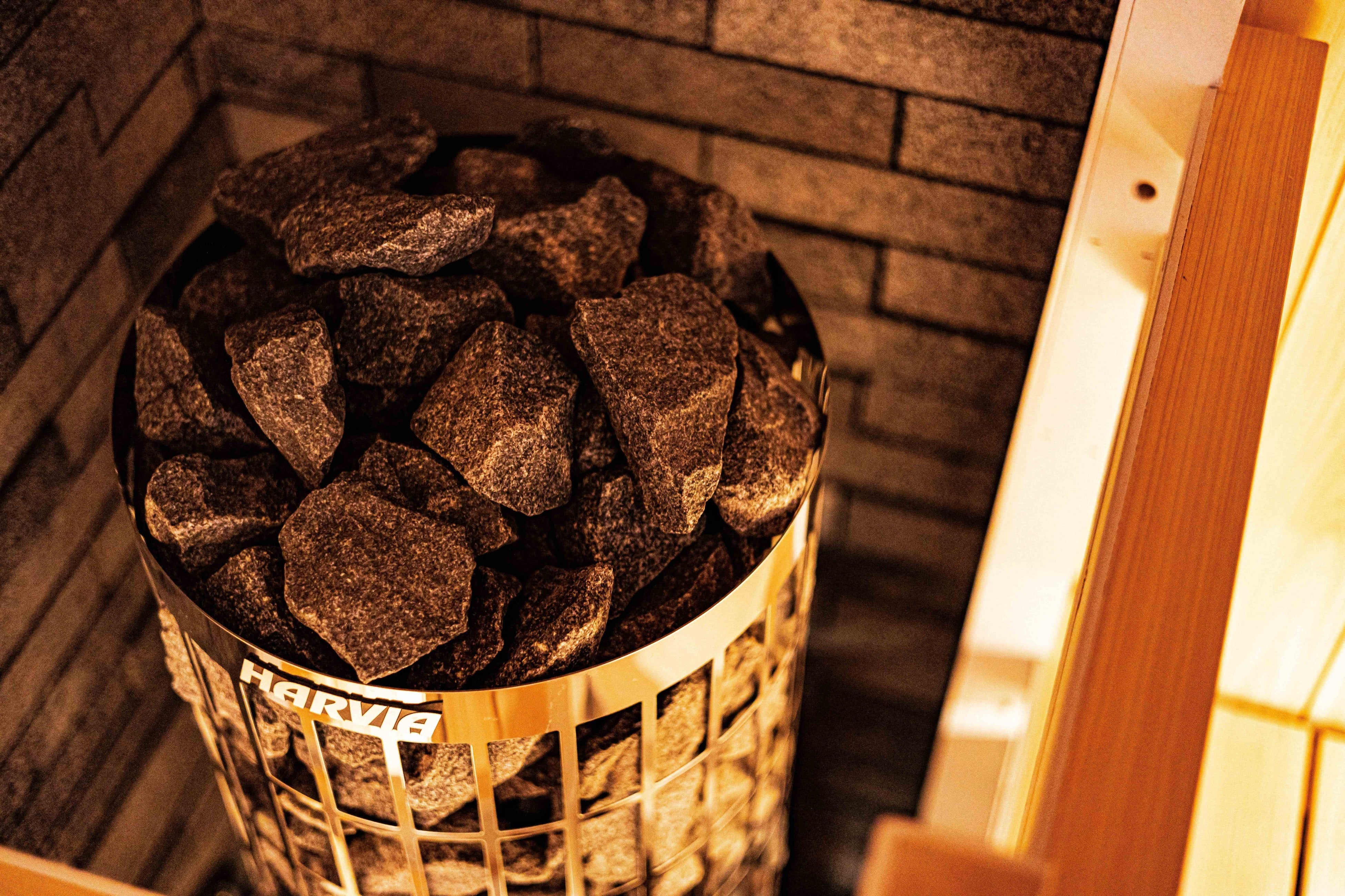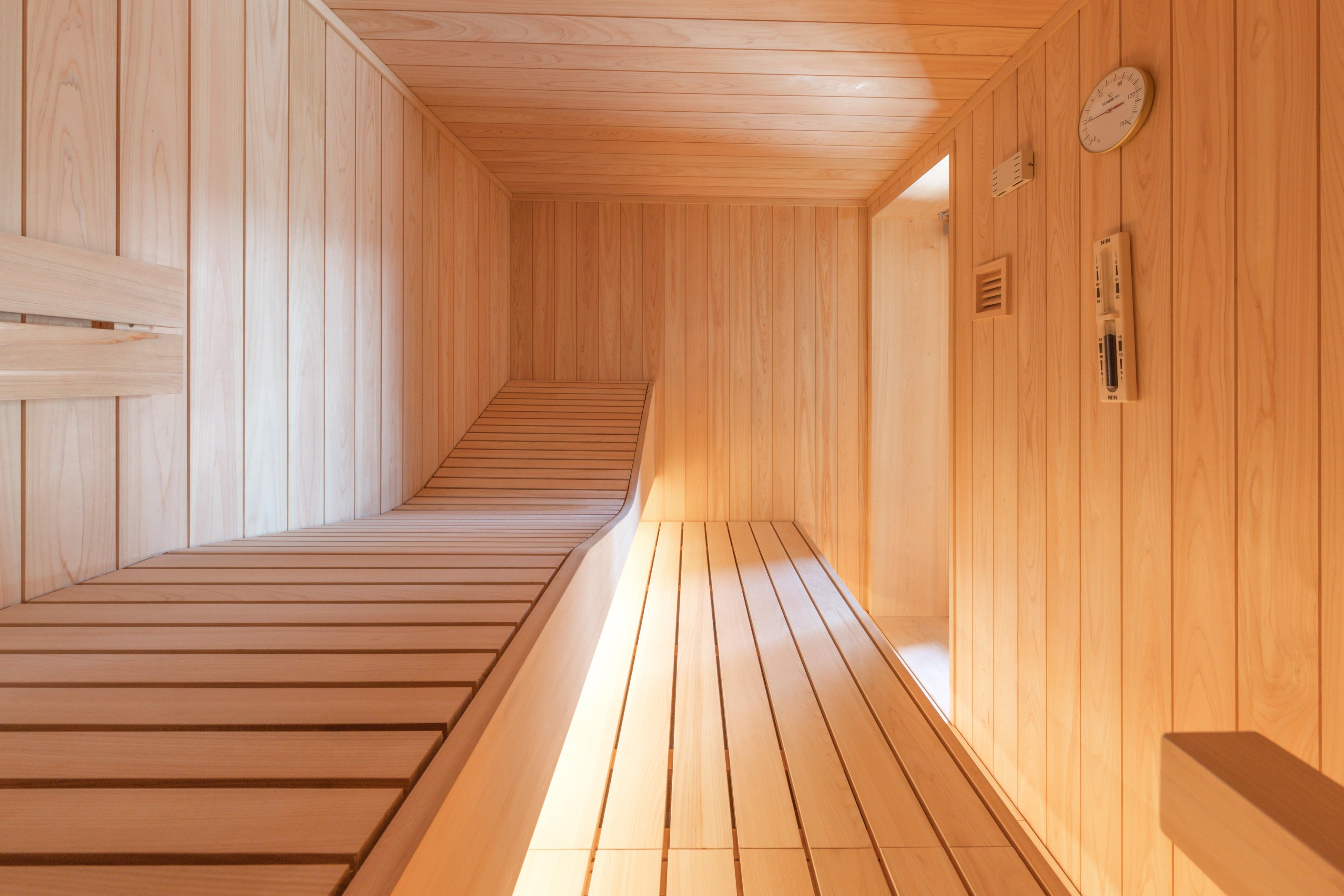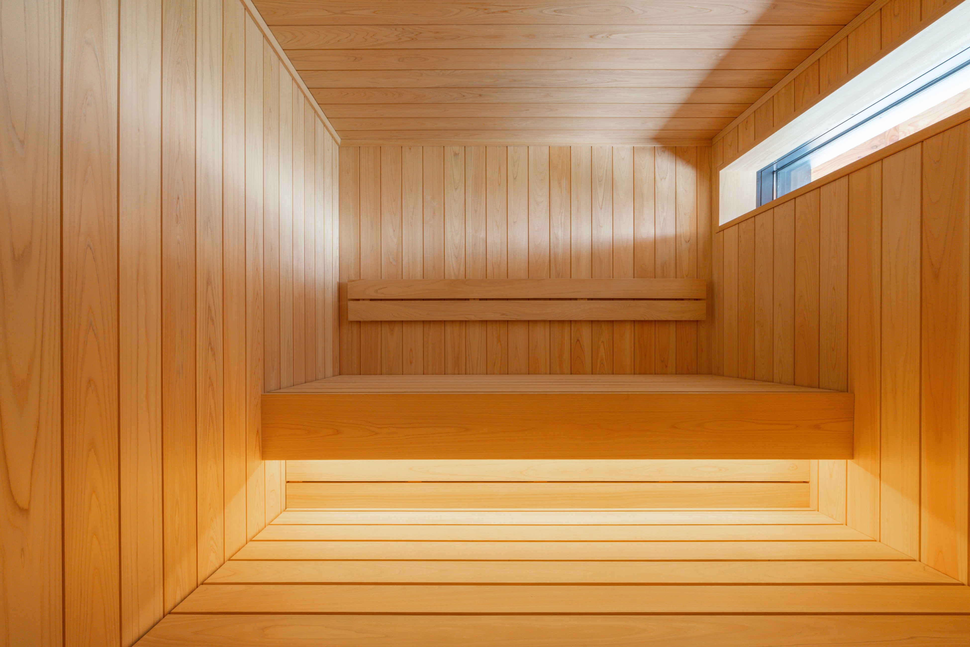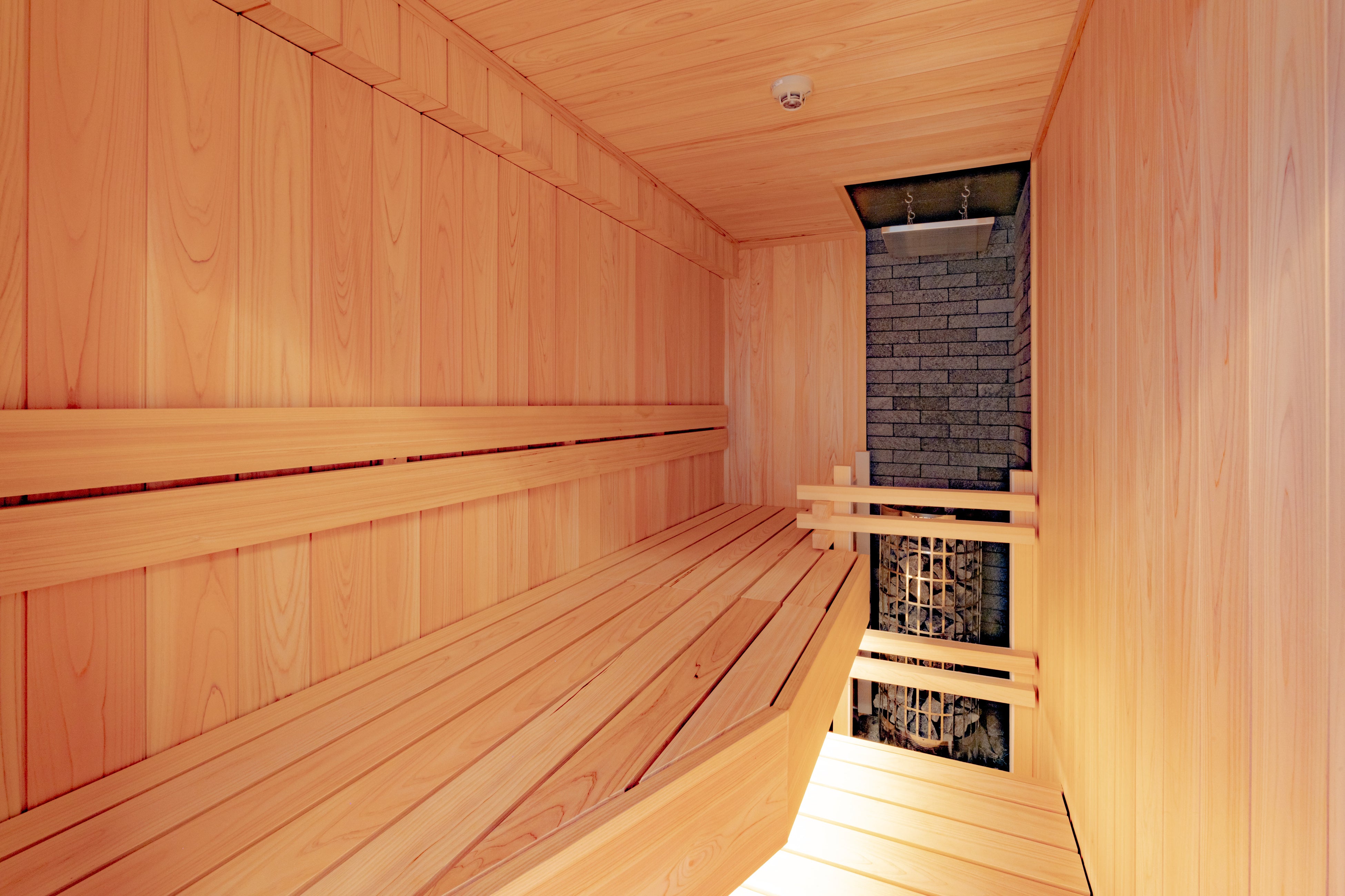 内装を日本の伝統色「呂」で仕上げ、照明照度を最小限にした「黒いサウナ」。