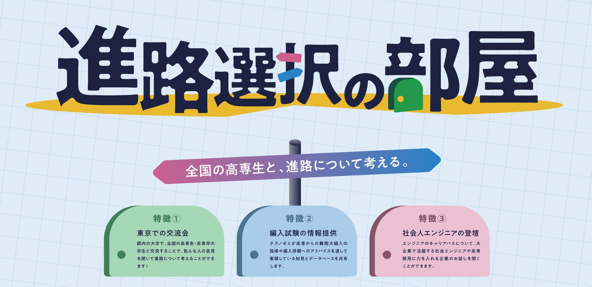 イベントの内容としては、高専生に対し、就職および進学に関する幅広い情報を提供するとともに、企業との交流や懇親の機会を設けます。具体的には、就職に関しては、高専生と協賛企業による交流セッション、企業の登壇、求人票やインターンシップ情報の提供を実施します。また、進学に関しても、高専生に対し大学情報の収集が行える企画を用意しております。これらの企画を融合した「進路選択の部屋」を通じ、就職と進学の両面で高専生が有益な情報を得られる場を提供いたします。また、高専卒東大発のテクノゼミがAI等の最先端の技術を活用して高専生目線・企業目線での課題を分析・整理することで、高専人材の進路選択について企業と学生の両者で考えます。