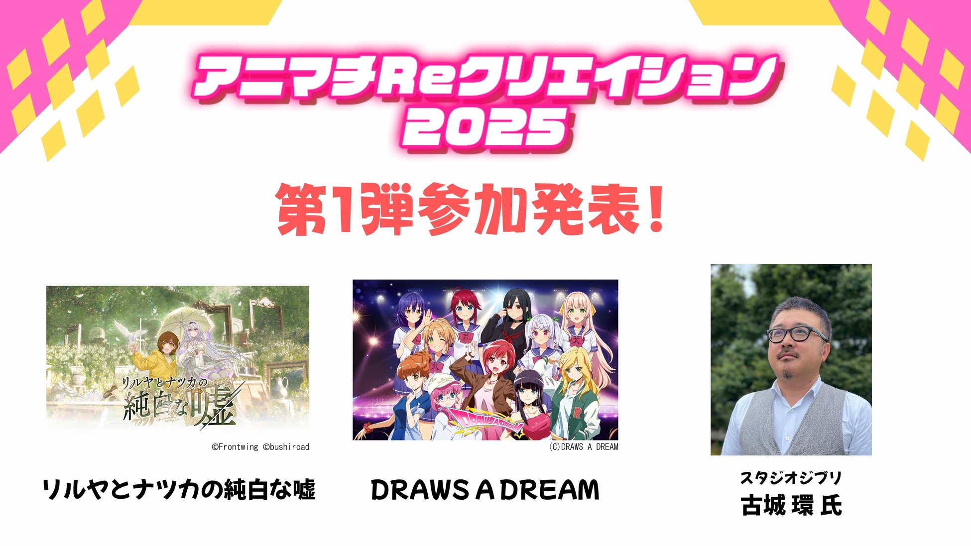 2025年3月に東京都小金井市内各所にて開催される「アニマチReクリエイション2025」に、「リルヤとナツカの純白な嘘」(イベント出演:リルヤ・メリ 役の高柳知葉さん、空木 夏夏 役の伊駒ゆりえさん)、スタジオジブリからポストプロダクションを担当する古城環氏にお越し頂き「スタジオジブリ作品の音」についてのトークショー、次世代声優アイドルのオーディションプロジェクト「DRAWS A DREAM(ドローズ・ア・ドリーム)」の参加が決定しました!
