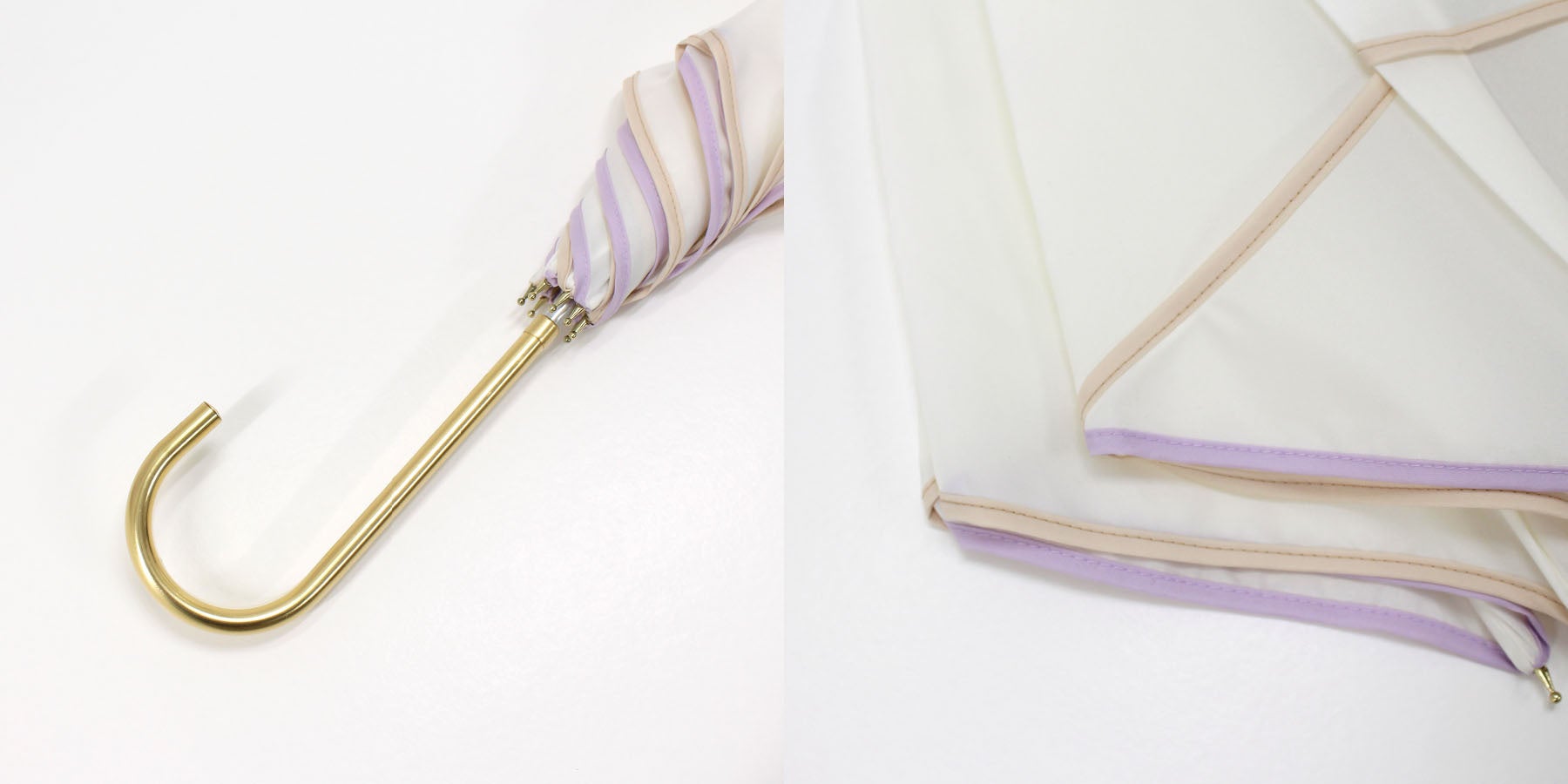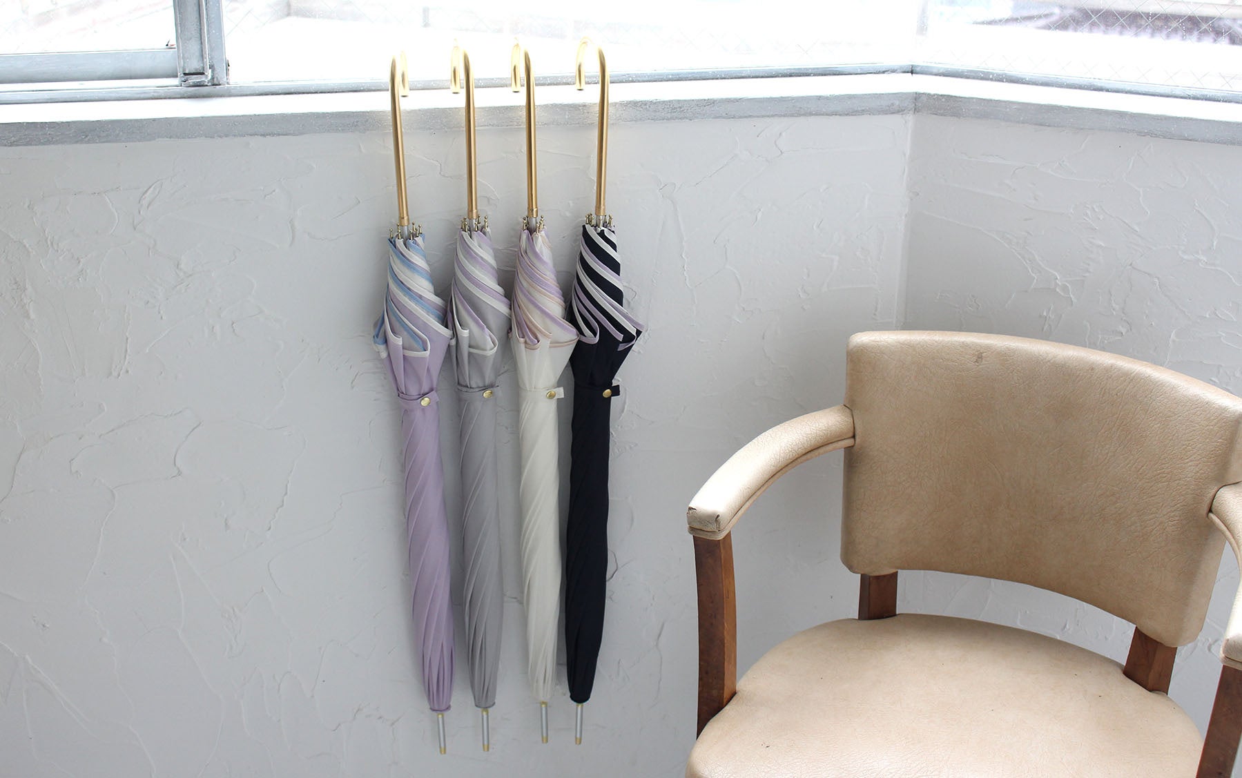 カラーはネイビー、グレー、オフホワイト、ラベンダーの4色。ベーシックなカラーから、淡色まで展開しているので洋服に合わせてチョイスできます。ハンドルやつゆ先部分のゴールドが高級感をプラス。