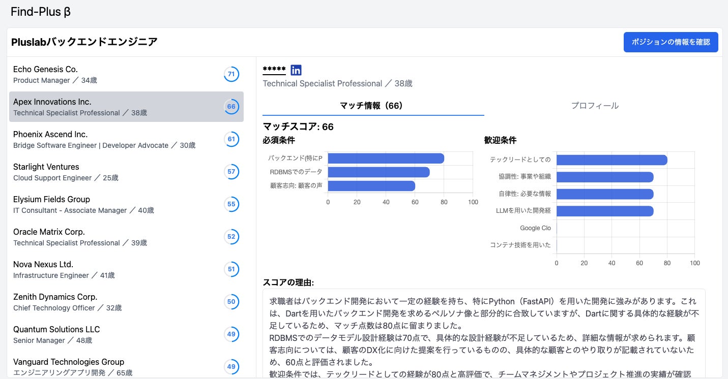 特徴として、Pluslab社独自のAIマッチング技術を活用して、従来の検索では特定できなかった、求職者のスキルや経験を元に検索することが可能です。