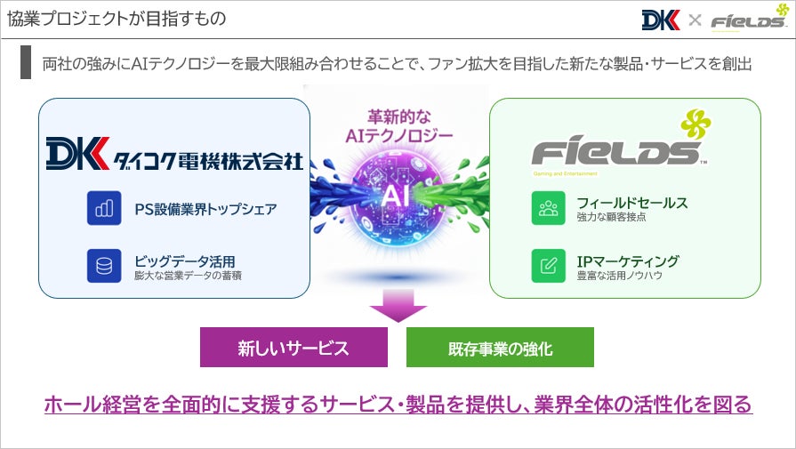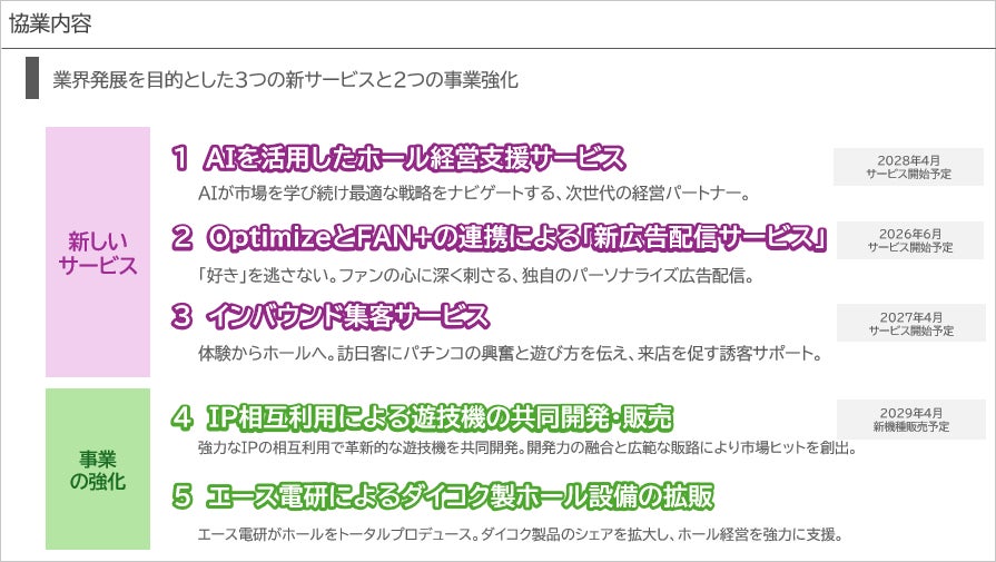 本提携に基づき、AIを活用したホール集客システムの構築、IP相互利用による遊技機の共同開発および販売、遊技空間の共同研究、ならびに業界発展に資する商品・サービスの共同研究・開発などについて検討を進めていくことで合意しております。