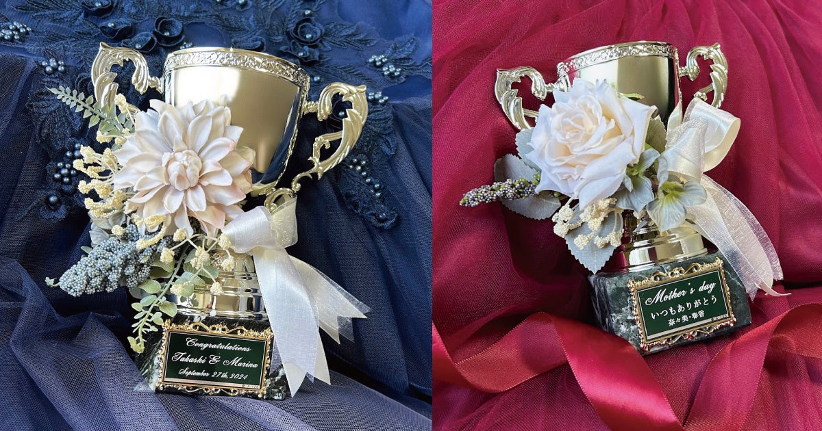 「Bloom」は英語で「花」を意味するだけでなく、「開花する」「成功する」といった意味も込められており、まさに人生の輝かしい瞬間を彩るのに相応しいトロフィー・カップです。