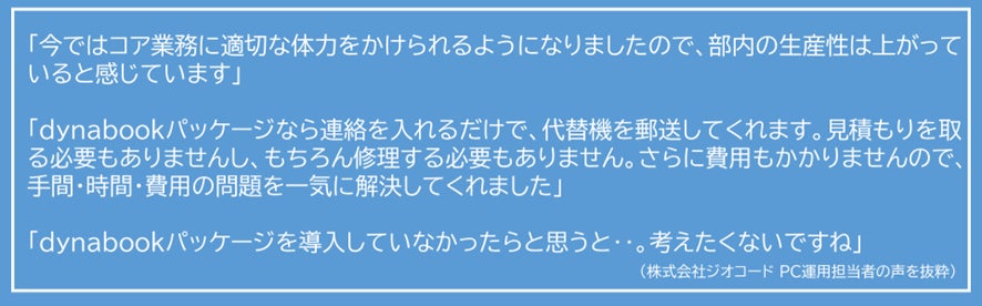 株式会社インボイス(代表取締役:加茂 正巳 本社:東京都千代田区)は、PCライフサイクルマネジメントサービス「dynabookパッケージ」が、株式会社ジオコード(代表取締役:原口 大輔 所在地:東京都新宿区)に採用されましたことを受け、インタビューを実施しましたのでお知らせいたします。