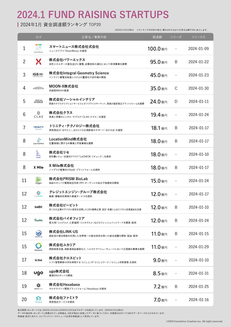 スタートアップの生態系の進化に貢献するため、株式会社EmolutionCreative(エモリューションクリエイティブ)が運営する情報プラットフォーム「uniqorns(ユニコーンズ)」は、2024年1月の国内スタートアップの資金調達状況を集計し、uniqorns内で公開しました。