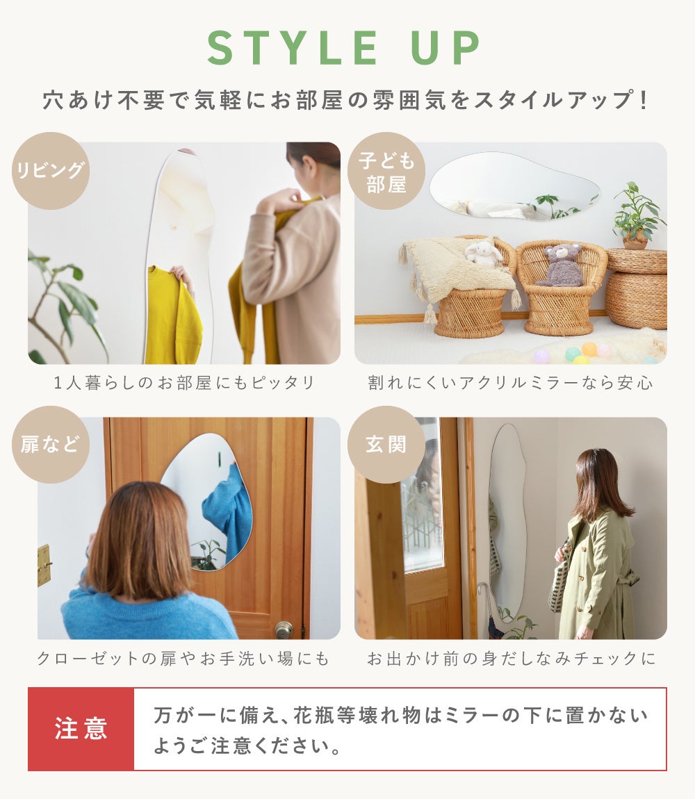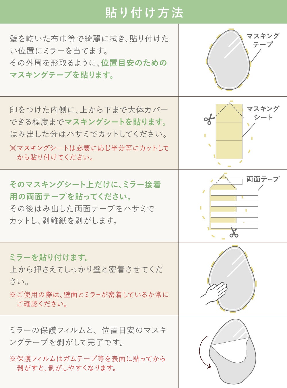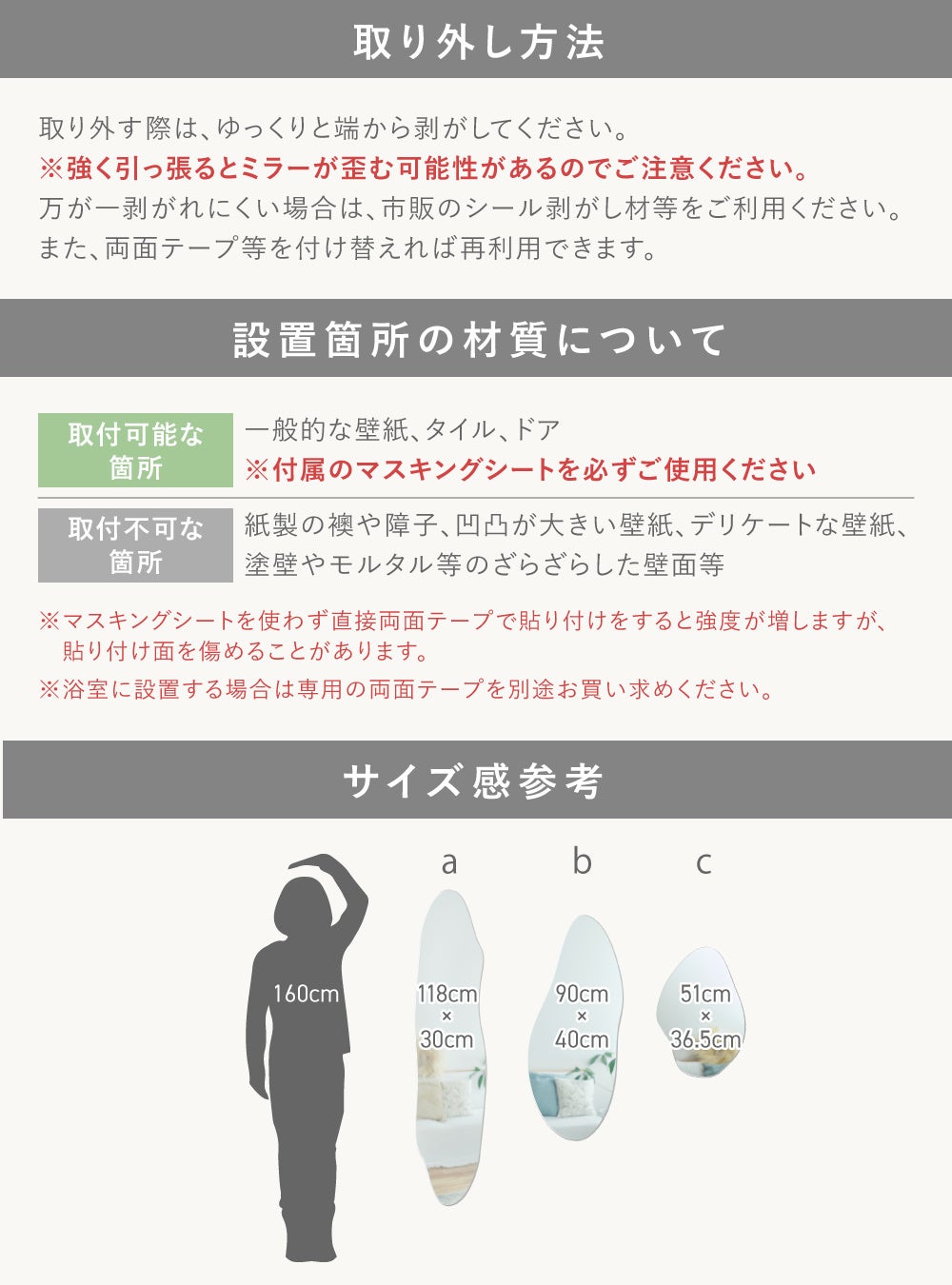 ガラスミラーと比べてアクリルミラーは断然軽いので、好きな場所に貼り付けることができます。付属のマスキングシートを使えば、両面テープで壁紙が剥がれる心配も減らせます。