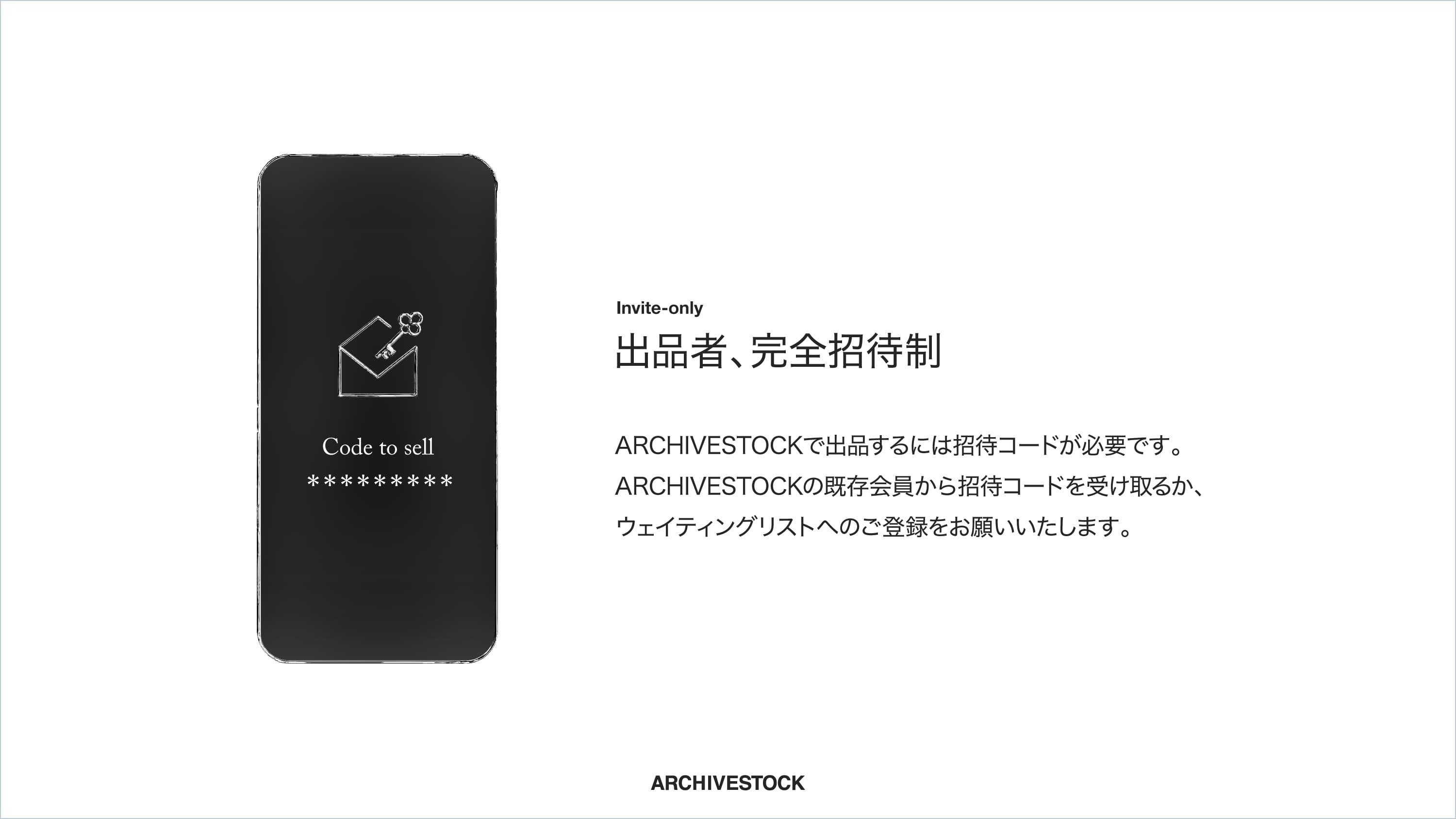 昨今のオンライン古着市場における不正取引や贋作品の流通事情等を踏まえ、ARCHIVESTOCKでは〈招待コード〉をお持ちの方のみがアイテムを出品・販売することができる仕組みとなっています。