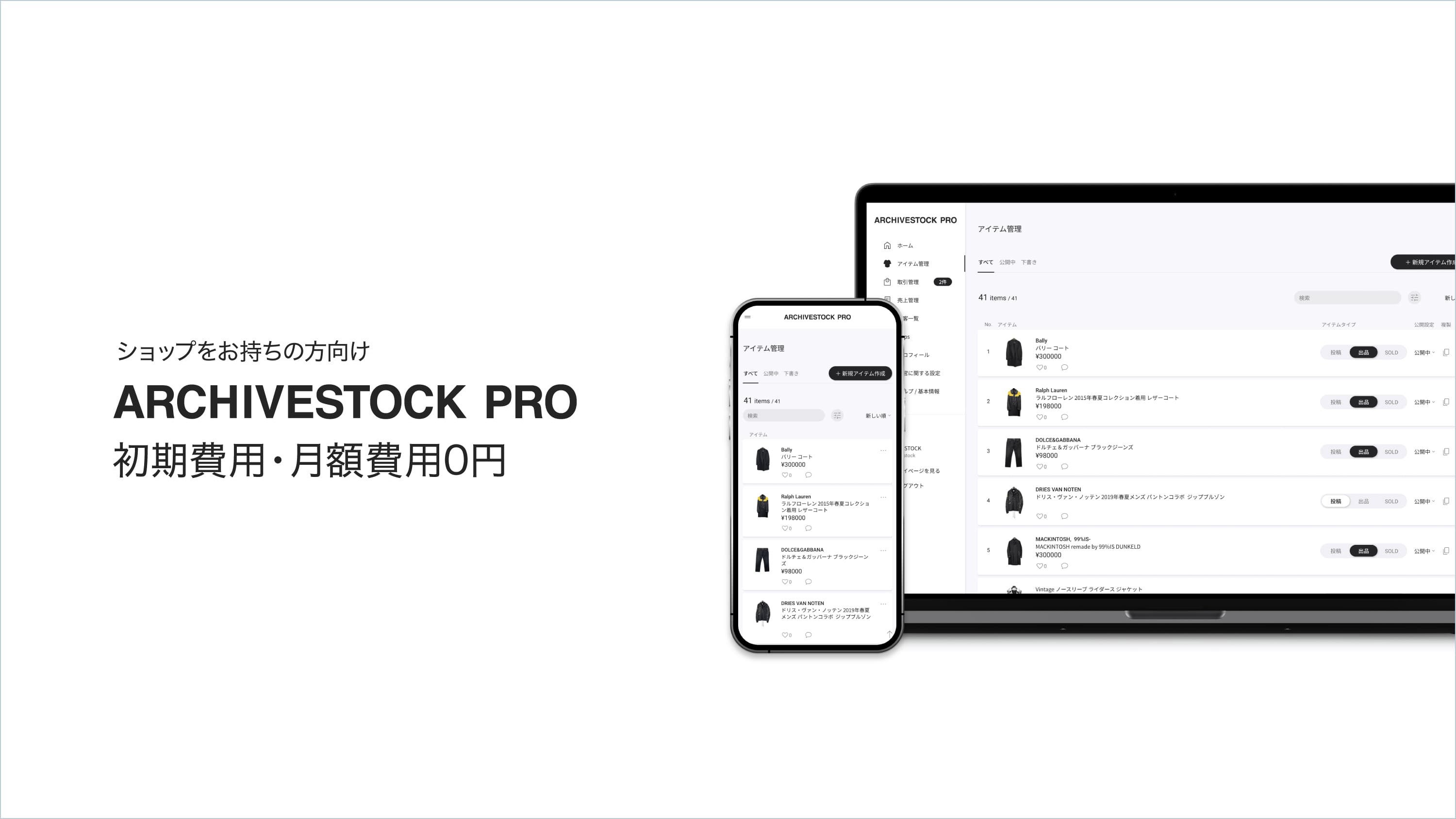 古着を取り扱う法人・個人事業主さまは、iOSアプリ/Webサイトの機能に加え、一点物の古着販売に特化したダッシュボード「ARCHIVESTOCK PRO」(アーカイブストック プロ)のご利用が可能です。事業者としてご登録いただくと、ポップアップイベントの告知や取材など、実店舗への誘導までを含めてサポートいたします。出店をご希望される法人・個人事業主さまは気軽にお問い合わせください。