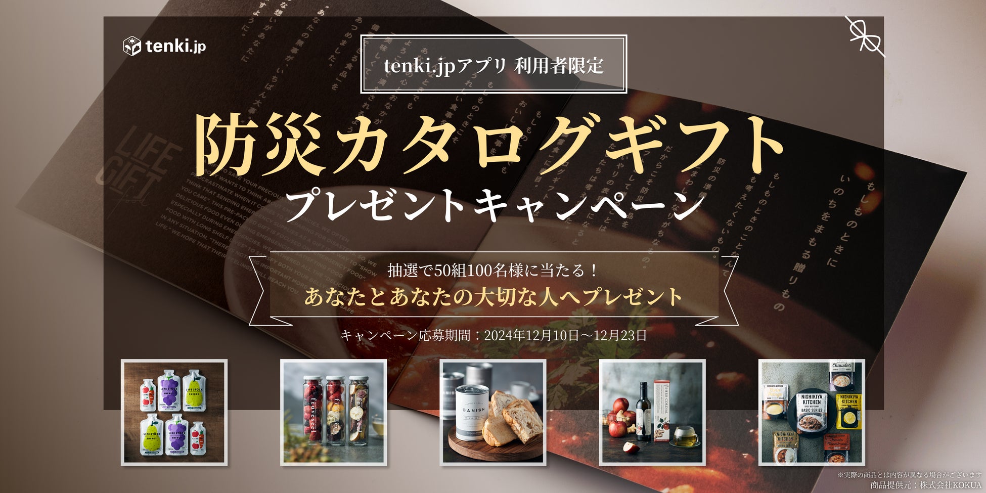 一般財団法人 日本気象協会(本社:東京都豊島区、理事長:渡邊 一洋、以下「日本気象協会」)は、天気予報専門メディア「tenki.jp(てんきじぇーぴー)」のアプリ利用者向けに、2024年12月10日(火)から「防災カタログギフトプレゼントキャンペーン(以下、本キャンペーン)」を実施します。