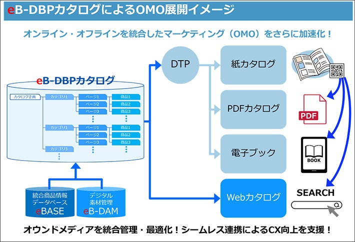 「eB-DBPカタログ」は、現在各社が取り組むオンライン・オフラインを統合したマーケティング(OMO)をさらに加速化し、複数チャネルのオウンドメディアを統合管理、最適化し、シームレス連携によるCX向上を支援します。