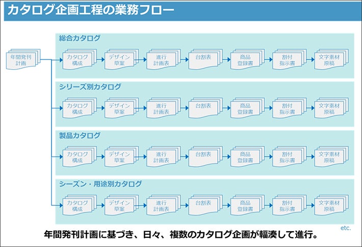 総合カタログや、シリーズ別カタログ、製品カタログ等、年間発刊計画に基づいて、日々、複数のカタログ企画が輻湊して進みます。
