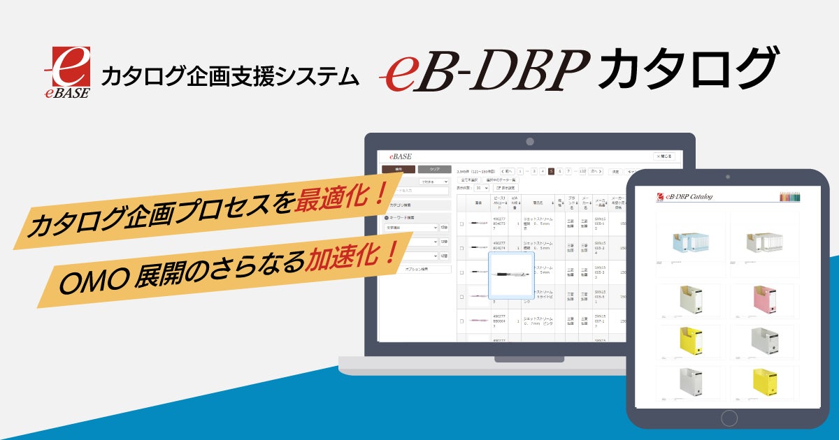 eBASE(イーベース)株式会社(本社:大阪市北区 代表取締役社長 岩田 貴夫/以下、eBASE社)は、カタログ企画プロセスを最適化し、次世代のOMO(Online Merges with Offline)展開を加速化するカタログ企画支援システム「eB-DBPカタログ」を開発、リリースします。これまで商品の魅力を最大限に伝える紙カタログは、ビジネスにおいて重要な役割を果たしてきました。しかし、デジタル化が進む現代において、その企画・制作には多くの課題が残されており、昨今のデジタル変革(DX: Digital Transformation)が進む中で、商品カタログの意義と企画・制作プロセスを再定義することが急務となりました。